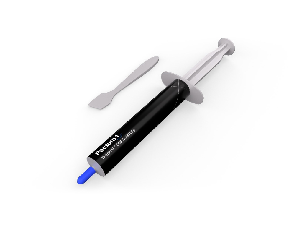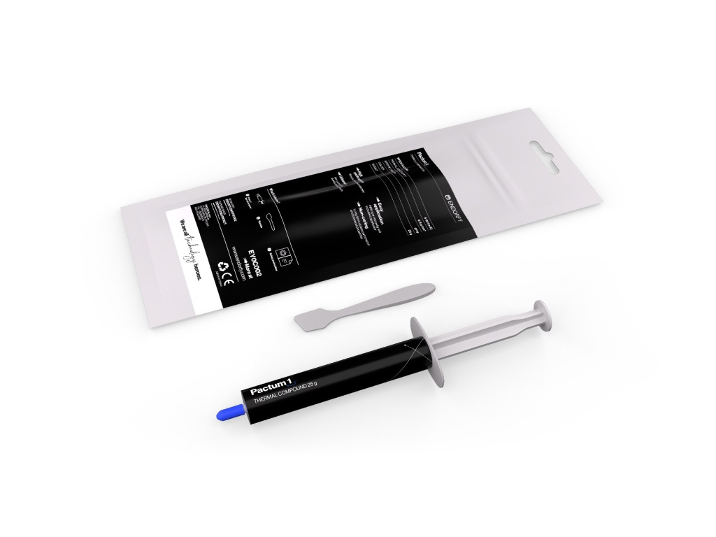 Teplovodní pasta Pactum 1 25 g byla vyrobena s ohledem na efektivní vedení tepla. 25 gramů tohoto produktu, uzavřené v praktickém aplikátoru, jsou více než dostatečné pro zajištění více přesných a rovnoměrných aplikací. Stačí nanést tenkou vrstvu na procesor a můžete začít.