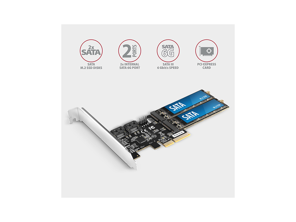 dva SATA III porty a dva sloty pro SATA M.2 disky s přenosovou rychlostí až 6Gb/s. Kombinace dvouportového SATA III řadiče a dvou SATA M.2 slotů dělá z karty velice užitečné zařízení pro rozšíření vašeho počítače. Snadno tak připojíte až čtyři disky např. dva 3.5“ disky nebo optické mechaniky a dva SATA M.2 disky. Karta osazená čipsetem