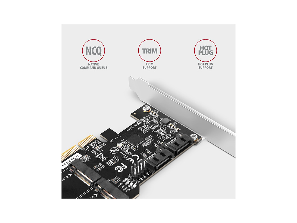Další vlastnosti: • Plná podpora Plug and Play. • Vyhovuje Serial ATA 3.0 specifikaci (SATA/600), přenosové rychlosti až 6 Gb/s (600 MB/s). • Vyhovuje Serial ATA 2.0 specifikaci (SATA/300), přenosové rychlosti až 3 Gb/s (300 MB/s). • Vyhovuje Serial ATA 1.0 specifikaci (SATA/150), přenosové rychlosti až 1.5 Gb/s (150 MB/s). • Vyhovuje Serial ATA AHCI (Advanced Host Controller Interface) specifikaci revize 1.4. • Podpora Hot Plug umožňující připojení a odpojení SATA zařízení za chodu. • Podpora Native Command Queuing (NCQ). • Podpora funkce TRIM pro SSD disky. • Podpora funkce Port Multiplier Command Based Switching. • Podpora bootování z připojeného disku vč. spolupráce s BIOS/UEFI základní desky počítače. • 4x LED pro indikaci aktivity připojených disků. • Čtyři 2-pinové patice pro připojení HDD LED kontrolek skříně. • Použit čipset ASMedia ASM1164.
