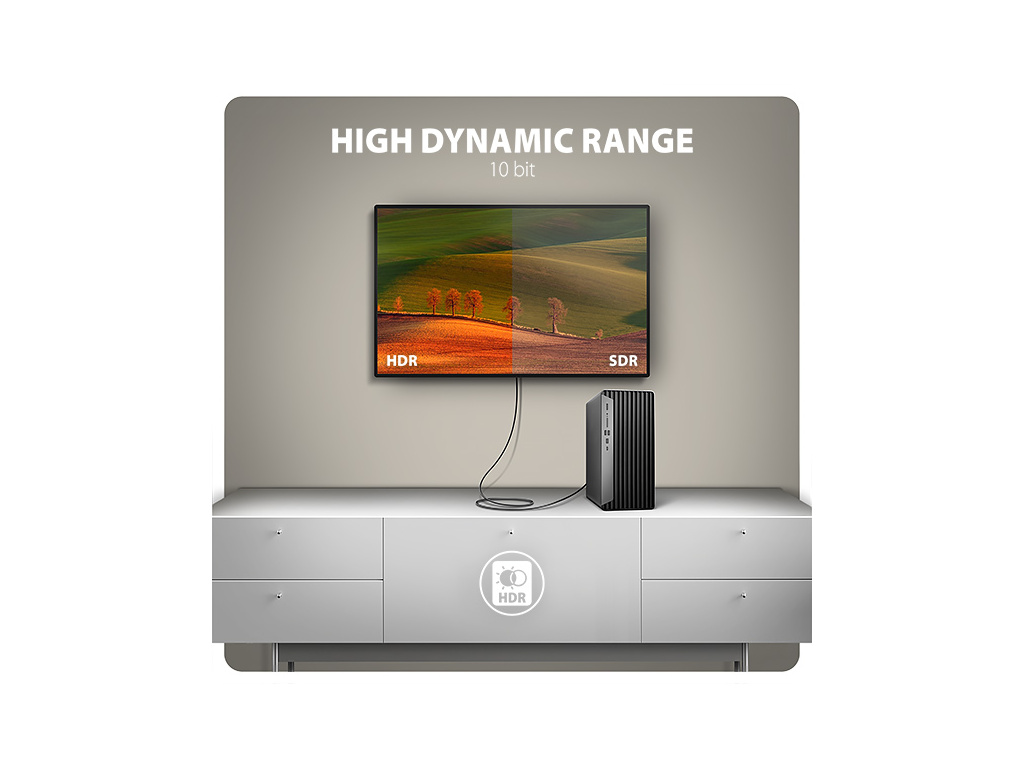 Další vlastnosti: • Podpora přenosu bezztrátového až 8-kanálového zvuku - 192kHz při 24-bitech. • Podpora DDC (Display Data Channel) - inteligentní nastavení rozlišení, frekvence a dalších parametrů dle zdrojového grafického čipu. • Podporované módy: zrcadlení plochy primárního monitoru (default nastavení), rozšíření plochy primárního monitoru. • Podpora HDR (High Dynamic Range, 10 bit support) - realistická reprodukce světlých a tmavých detailů. • Podpora HPD (Hot-Plug-Detect) - komunikační sekvence řídící připojování/odpojování zařízení za chodu. • Podpora HDCP 2.3 (8K, 4K, QHD, FullHD) - zpětně kompatibilní s HDCP 2.2 a 1.4. • Podpora power saving módů s uspáváním řízeným zdrojovým zařízením (PC) i zobrazovacím zařízením (monitor/TV). • Napájení po sběrnici - není potřeba žádné externí napájení. • Rozměry 9 x 38 x 21 mm (V x Š x H). • Hmotnost 71 g (vč. kabelu). • Kabel délky 1.8 m.