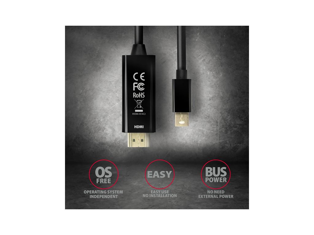 AXAGON RVDM-HI14C2 pro připojení HDMI monitoru/TV/projektoru k počítači s výstupem Mini DisplayPort. Šikovný malý hardwarový převodník bez potřeby jakékoliv instalace či nastavování zajistí kvalitní přenos obrazu i zvuku až do