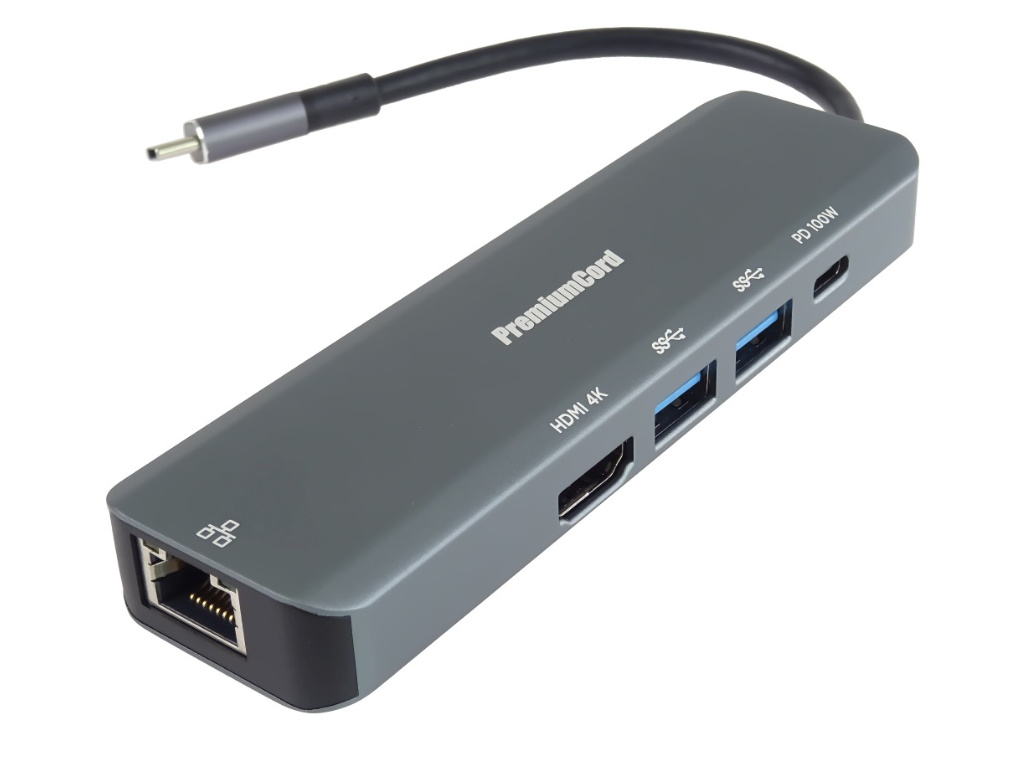 PremiumCord USB-C na HDMI + 2x USB3.2 + PD 100W+ RJ45 10/100/1000Mbps adaptér Tento adaptér umožňuje vysoce kvalitní převod videa a zvuku z USB-C konektoru na HDMI konektor pro další monitor/TV/projektor. Funguje jako externí grafická karta. Umožní přidat další monitor a USB periferii nebo paměť a současně napájet přes konektor PD. Umožňuje také pracovat na více obrazovkách současně. Adaptér připojí do sítě ethernet a umožní připojit externí USB paměť nebo vložit paměťovou kartu. Udělejte si svůj pracovní den více zábavný a pohodlnější, pracujte na dvou obrazovkách současně. - Víceportový adaptér USB-C obsahuje vysokorychlostní port Ethernet / RJ-45, nabíjecí port 100W PD, dva porty USB 3.2 , video výstup 4K HDMI - Rozlišení obrazu HDMI: 4K@30Hz a FULL HD 1080p - Vstupní konektor: USB-C male / Thunderbolt 3.0 , kompatibilní s VESA Displayport V1.2 - Výstupní konektor: HDMI female + 2xUSB3.2 female + PD (power delivery) + RJ45 konektor na ethernet 10/100/1000Mbps - HDMI konektor na připojení dalšího monitoru, TV, projektoru - Kompatibilní s HDMI 2.0 , rozlišení: 38402160 4K 30HZ - Podporuje: HDCP1.4 - Dva USB3.2 konektory typ A s rychlostí 5Gbps pro připojení flash paměti nebo jiného USB zařízení nebo pro napájení, nabíjení přes USB - Dva USB3.2 porty - univerzální seriály BUS 3.2 Specifikace Revize 1.0, zpětná kompatibilní s USB 2.0, 1.1, 1.0 - Power delivery PD Konektor USB-C pro nabíjení 20V až 5A (výkon až 100W) - Konektor RJ45 10/100/1000Mbps pro rychlé připojení to počítačové sítě nebo do internetu - Podpora plně duplexního provozu dle normy IEEE 802.3x, plně kompatibilní s IEEE 802.3, IEEE802.3U a IEEE802.3ab - Adaptér přenáší digitální obrazu i zvuk - Plug and play. - Typ C konektor s možností zapojení v jakémkoliv směru - Barva: šedá - Kompaktní zastříknuté odolné pouzdro - Balení v sáčku s EAN kódem a popisem - Funguje s novými zařízeními s USB-C podporujícími DisplayPort Alternate modes Macbook 12´, MacBook Pro2016/2017/2018/2019, MackBook Air 2018/2019, iPad Pro2018, Cromebook, NINTENDO SWITCH,HUAWEI mate30/mate30pro,SAMSUNG S10/S9/Note8/Note9,HP SpecterPavilion, HUAWEI Matebook,Dell XPS series,Mi Air atd....