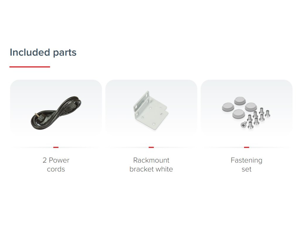 Balení obsahuje: Cloud Core Router CCR2004-16G-2S+ určený pro montáž do racku (1U), dva napájecí kabely a rackmount kit.