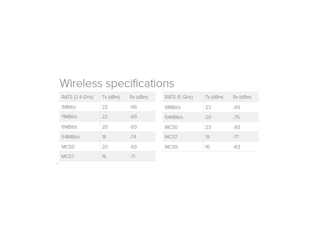 (2.4GHz využívá 802.11b/g/b, dual chain 1.5dBi anténa, 300Mbps / 5GHz jede na 802.11ac a nechybí ani zpětná kompatibilita s 802.11a/n., single chain - 2dBi anténa, 433Mbps). Tato duální wifi tak dosahuje celkových přenosových rychlostí až 733Mbps. Procesor je taktován na 650MHz a sekunduje mu 64MB RAM operační paměti typu DDR. K dispozici je celkem pět ethernetových portů 100Mbps s podporou PoE in(port1) taktéž out (port5).