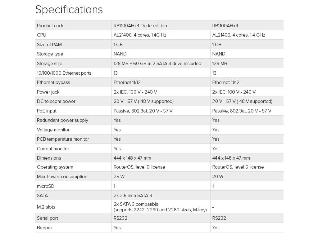 Verze bez disku Systémové řešení platforem firmy MikroTik pro poskytovatele bezdrátového připojení k síti Internet. Jedná se o gigabitový routerboard v rack verzi osazený 13x RJ45 10/100/1000 Mbps MDI/MDI-X. Aktivovaný ROS Level 6, slot pro SD kartu, seriový port RS232, dodávka včetně 1U hliníkové rack šasi a zdroje. Poháněný Annapurna Alpine AL21400 CPU se čtyřmi Cortex A15 jádry, každý taktován na 1.4GHz a propustností až 7.5Gbit. RB podporuje IPsec hardware acceleration (až 2.2Gbps s AES128). Kromě redundantního napájení má ještě DC vstup a podporuje jak pasivní tak i aktivní PoE nápájení ve standardu 802.3at. RouterBoard lze dále rozšířit o mikroSD kartu, díky integrovanému hardwarovému akcelerátoru je ideální pro IPsec tunely. Technické specifikace: DHCP: Ano LAN porty: 13x 10/100/1000 Mbit/s Gigabit Ethernet, Auto-MDI/X Výchozí jméno: admin Spotřeba (W): 25 Procesor: PowerPC 4x 1400MHz with hardware encryption NAND (MB): 128 Rozšíření: 1x micro SD card I/O Control: Ano LED indikace: Ano OS: RouterOS Level 6 Podpora IPv6: Plná Výška (mm): 47 Šířka (mm): 444 Hloubka (mm): 148 Napájení max (jack) (V): 2x 230, 57 Napájení min (PoE) (V): 20 Napájení max (PoE) (V): 57 Provozní teplota min (°C): -20 Chlazení: Pasivní (bez ventilátoru) Upozornění: Výrobce MIKROTIK nevztahuje záruku na zařízení poškozená přepětím. Zařízení je třeba na vstupech adekvátně chránit proti indukovanému elektrostatickému přepětí či přepěťovým špičkám na silovém vedení. Při venkovních instalacích je třeba používat stíněnou kabeláž (FTP/SFTP), příslušné přepěťové ochrany (pokud nejsou integrovány) a provést korektní a efektivní uzemnění. Stránky o produktu: https://routerboard.com/RB1100Dx4