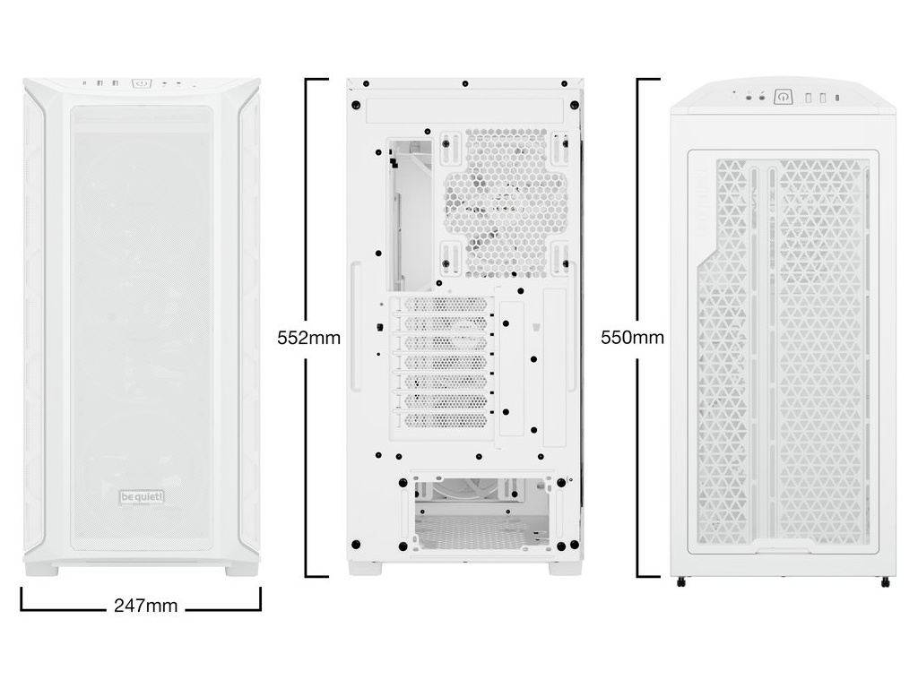 Be quiet! SHADOW BASE 800FXSkříň v provedení Middle Tower s průhlednou bočnicí a předním ARGB podsvícením nabízí dvě 3,5" pozice pro pevné disky a čtyři 2,5" pozice pro SSD disky. Na horním panelu naleznete dva porty USB 3.0, jeden port USB-C a dále také konektory pro sluchátka a mikrofon. Skříň je osazena čtyřmi ARGB ventilátory o velikosti 140 mm, a to v přední a zadní části, přesně tak, aby zaručily nejlepší průchod vzduchu. Ve skříni je dostatek prostoru pro chladič CPU do výšky až 180 mm a grafickou kartu o délce až 430 mm. Důmyslné řešení umožňuje pohodlné umístění až 420 mm dlouhého výměníku vodního chlazení na přední a vrchní straně. Potěší taktéž lišta pro lepší organizaci kabelů, dvojice prachových filtrů či integrovaný PWM/ARGB rozbočovač. Skříň je dodávána bez zdroje.