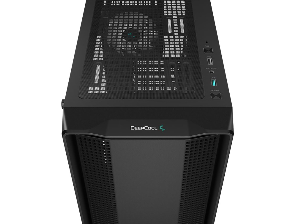 DEEPCOOL CC560 ARGB V2Skříň formátu Middle Tower s průhlednou bočnicí nabízí dvě 2,5" pozice pro SSD disky a dvě 3,5" pozice pro pevné disky. Na horním panelu se nachází jeden USB 3.0 port, jeden USB 2.0 port a kombinovaný port sluchátek a mikrofonu. Skříň je osazena celkem čtyřmi ventilátory s ARGB podsvícením o velikosti 120 mm. Důmyslné řešení umožňuje pohodlné umístění až 360 mm dlouhého výměníku vodního chlazení na přední straně. Ve skříni je dostatek prostoru pro chladič CPU do výšky až 165 mm a grafickou kartu o délce 370 mm. Dodávána je bez zdroje. Součástí je také magnetický prachový filtr na horním panelu.