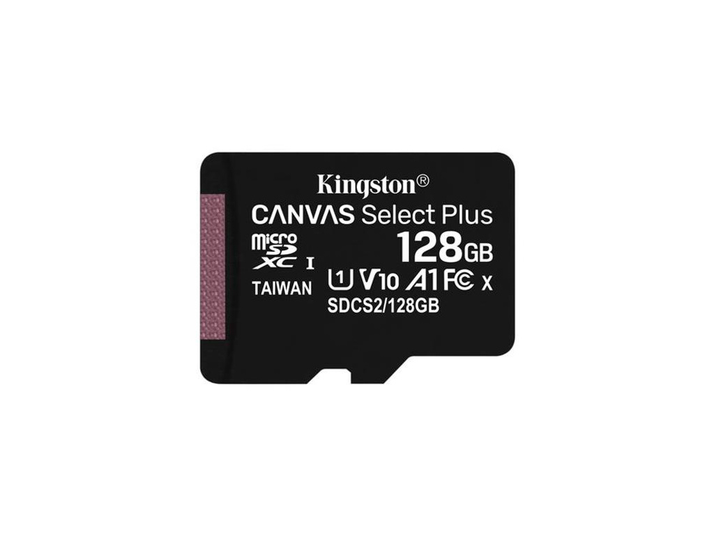 Kingston's Canvas Select Plus microSD card offers reliable performance, compatible with Android devices and cameras, with speeds up to 150MB/s*. With A1 app performance, it ensures smooth multitasking and fast load times. Durable and versatile, it's perfect for everyday storage needs. Kingston's Canvas Select Plus microSD is compatible with Android devices and designed with enhanced A1-rated performance. It offers reliable speed and large capacities for faster app loads and capturing images and videos in capacities up to 1TB**. Powerful in performance, speed, and durability, the Canvas Select Plus microSD is designed for reliability so you can take it anywhere with confidence that your photos, videos, and files will be protected. Available with a lifetime warranty. FEATURES Impressive speeds - Incredible read speeds up to 150MB/s.* Optimized for use with Android devices - Enhanced Android A1 Performance Class. Large capacities - Capacities up to 1TB** to store your photos and files. Durable - For peace of mind, cards are extensively tested and proven to be waterproof, temperature proof, and X-ray proof.*** SPECIFICATIONS Capacities** 64GB, 128GB, 256GB, 512GB, 1TB Standard/Class Class 10, UHS-I, U1/U3, Video Class 10/30, A1 Performance* 100MB/s Read, UHS-I Speed Class, U1, V10, A1 (64GB) 150MB/s Read, UHS-I Speed Class, U1, V10, A1 (128GB-256GB) 150MB/s Read, UHS-I Speed Class, U3, V30, A1 (512GB-1TB) microSDXC card dimensions 11mm x 15mm x 1mm SD adapter dimensions 24mm x 32mm x 2.1mm Format exFAT Operating temperature -25°C~85°C Storage temperature -40°C~85°C Voltage 3.3V Warranty/support Lifetime PART NUMBERS SD Adapter Included SDCS3/64GB SDCS3/128GB SDCS3/256GB SDCS3/512GB SDCS3/1TB SD Adapter Not Included SDCS3/64GBSP SDCS3/128GBSP SDCS3/256GBSP SDCS3/512GBSP SDCS3/1TBSP * Based on internal testing, performance will vary based on host device. Engineered with proprietary technology to reach read speeds beyond UHS-I 104MB/s specification, up to 150MB/s. Write speed may be lower for some capacities. Full performance requires MobileLite Plus Reader. ** Some of the listed capacity on a Flash storage device is used for formatting and other functions and thus is not available for data storage. As such, the actual available capacity for data storage is less than what is listed on the products. For more information, go to Kingston's Flash Memory Guide at kingston.com/flashguide. *** IEC/EN 60529 IPX7 certified for protection against continual water submersion up to 30 minutes and depth up to 1m. Withstands temperature range from -25°C to 85°C. Protected against X-ray exposure based on ISO7816-1 guidelines.EAN: 0740617348484