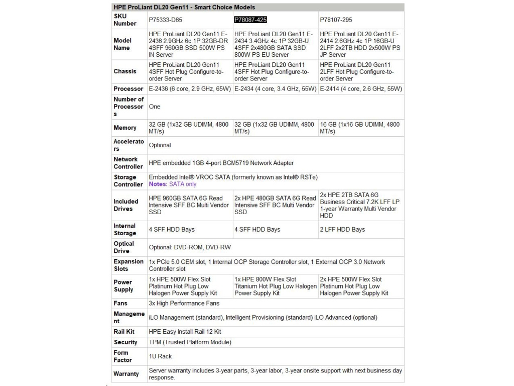 HPE PL DL20g11 E-2434 (3.4G/4C) 1x32G (P64339) 2x480G VROC 4SFF 1x800W 4x1G NBD333 Smart Choice, P78087-425