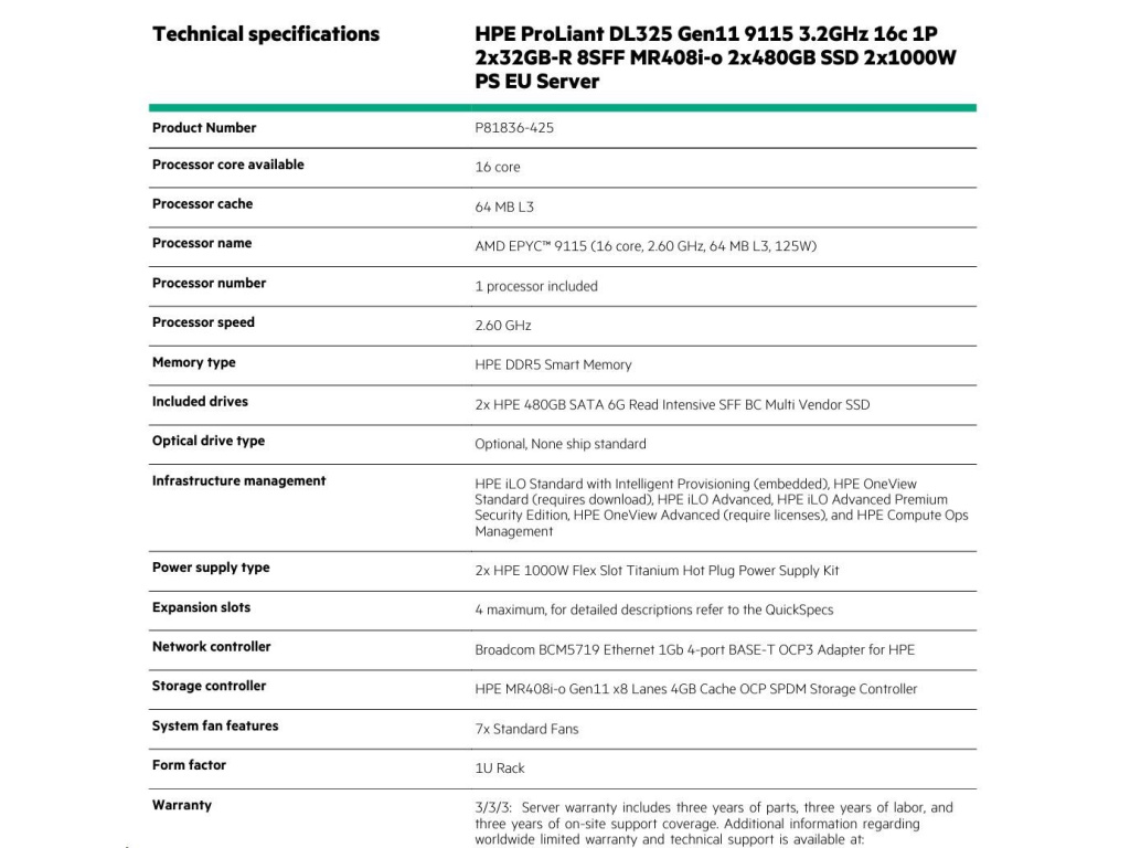 HPE PL DL325g11 AMD Epyc 9115 (2.6/16C) 2x32G (P64985) 2x480G 2x1000W MR408i-o/4G 8SFF 4p1Gocp Smart Choice, P81836-425