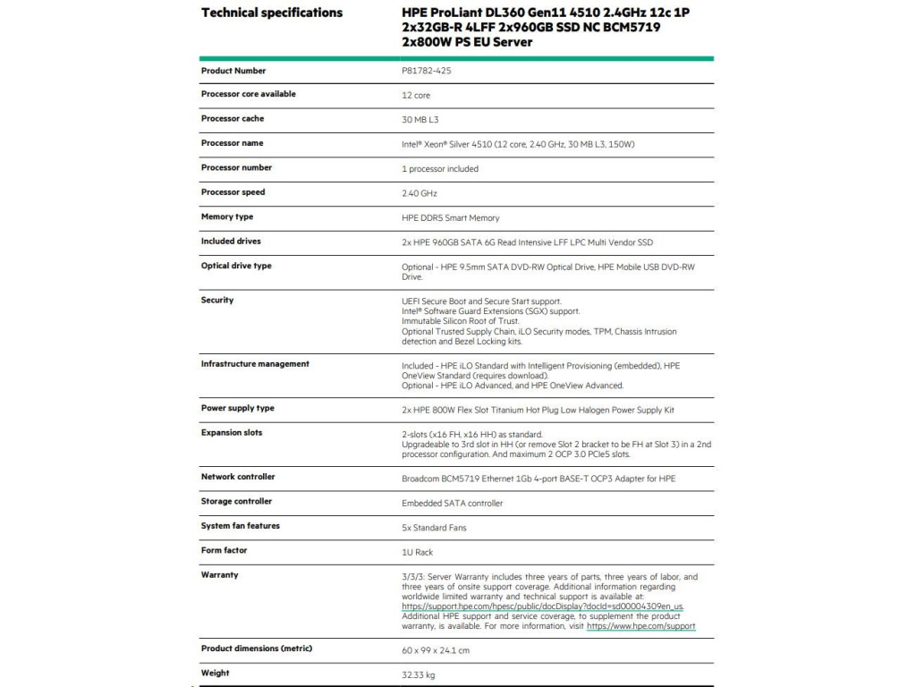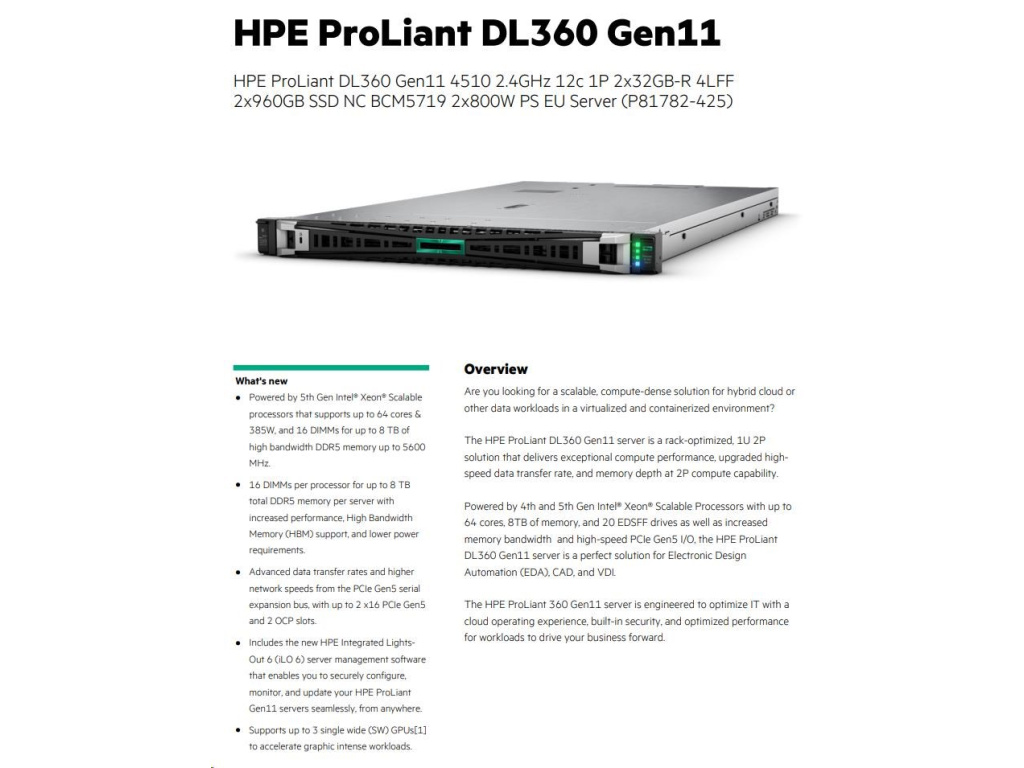 HPE PL DL360g11 4510 (2.4G/12C) 2x32G 2x960G VROC 4LFF LPC 2x800W 4x1G Smart ChoiceEAN: 4549821642120