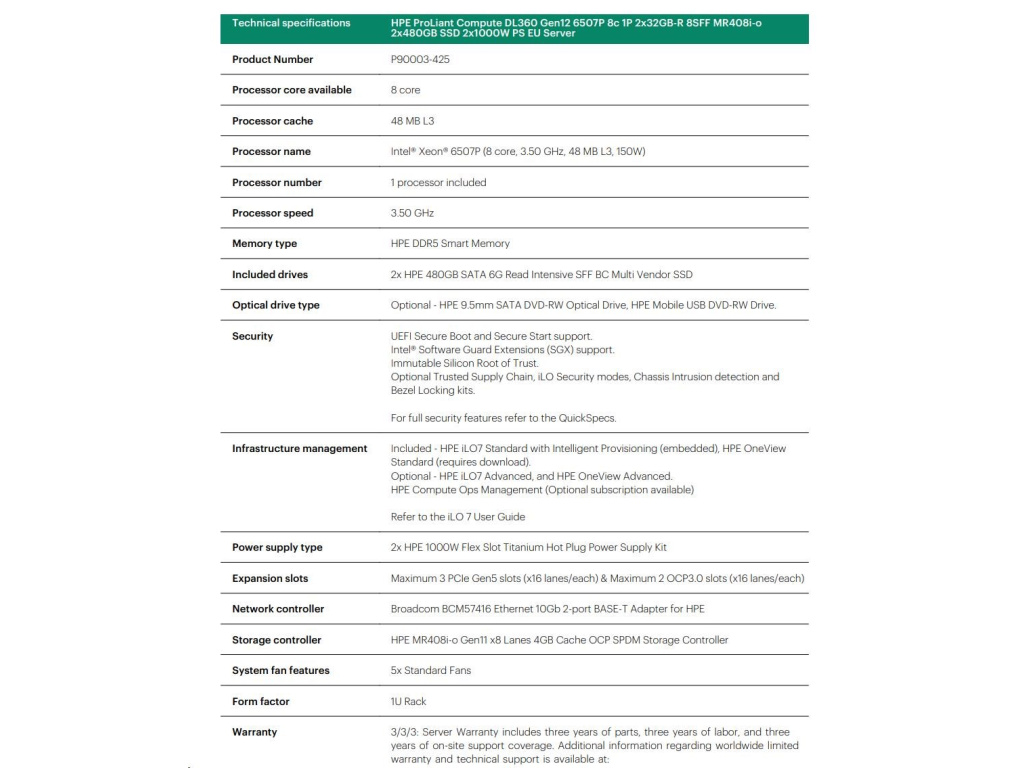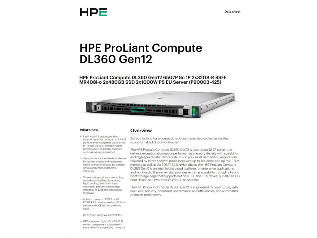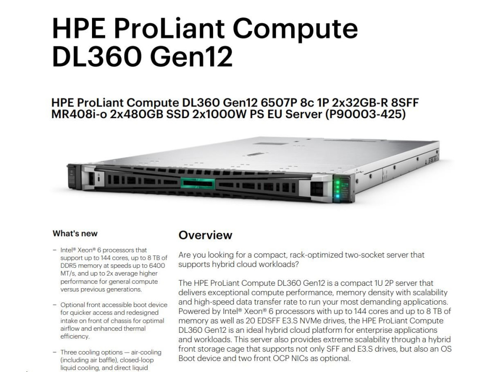 | Model Name | HPE ProLiant Compute DL360 Gen12 6507P 8c 1P 2x32GB-R 8SFF MR408i-o 2x480GB SSD 2x1000W PS EU Server |