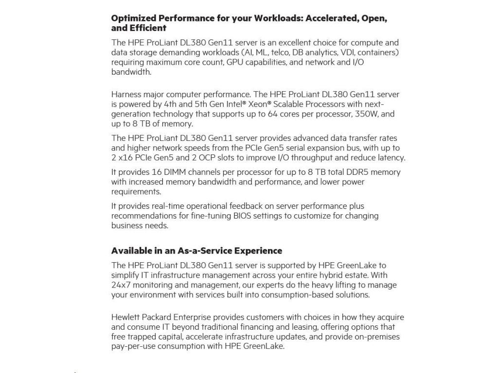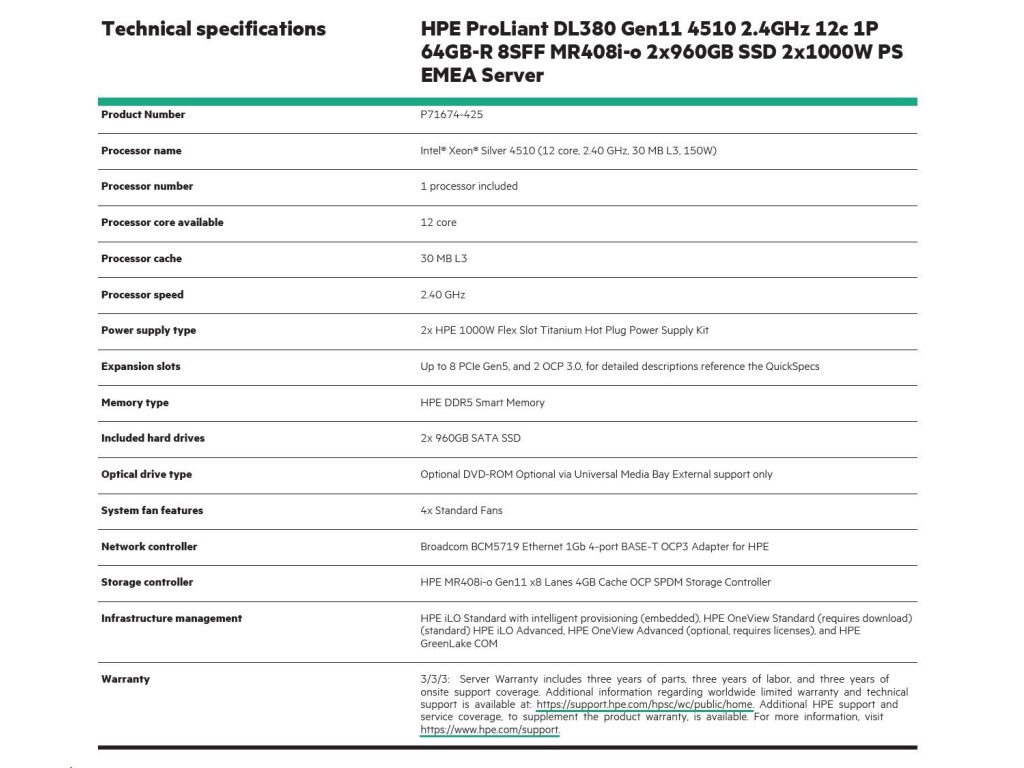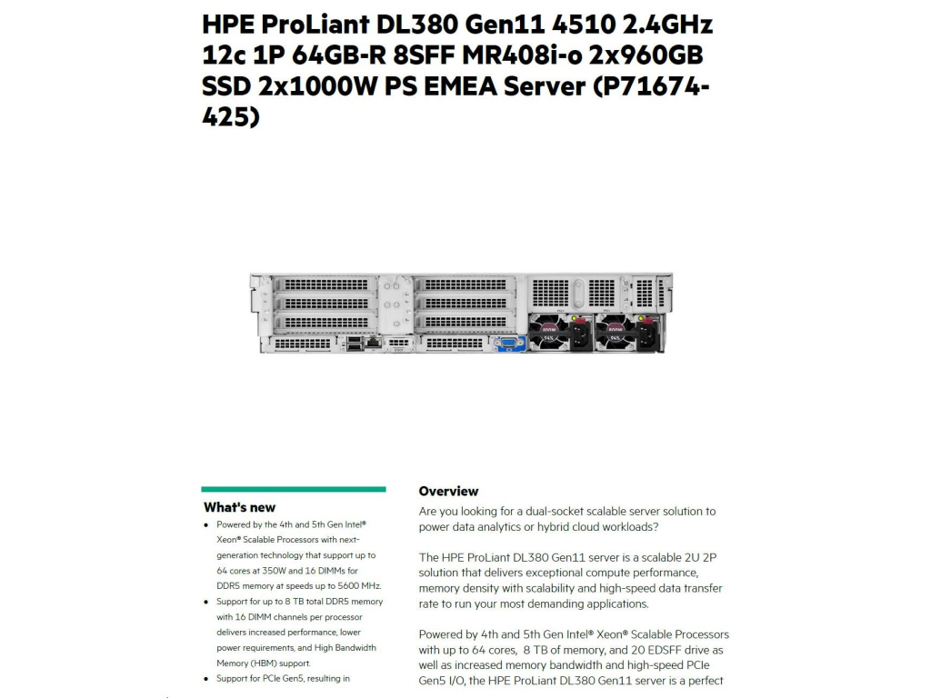 Model Name HPE PL DL380g11 4510 (2.4/12C) 2x32G 2x960G 8SFF MR408i-o 2x1000W 4x1Gb NBD333