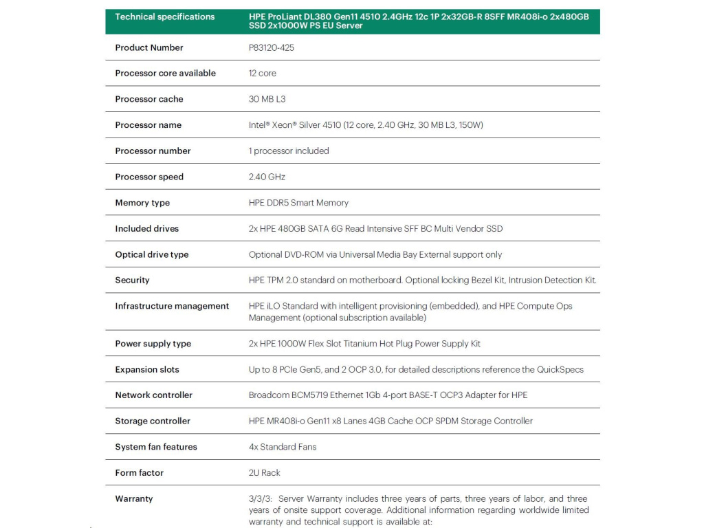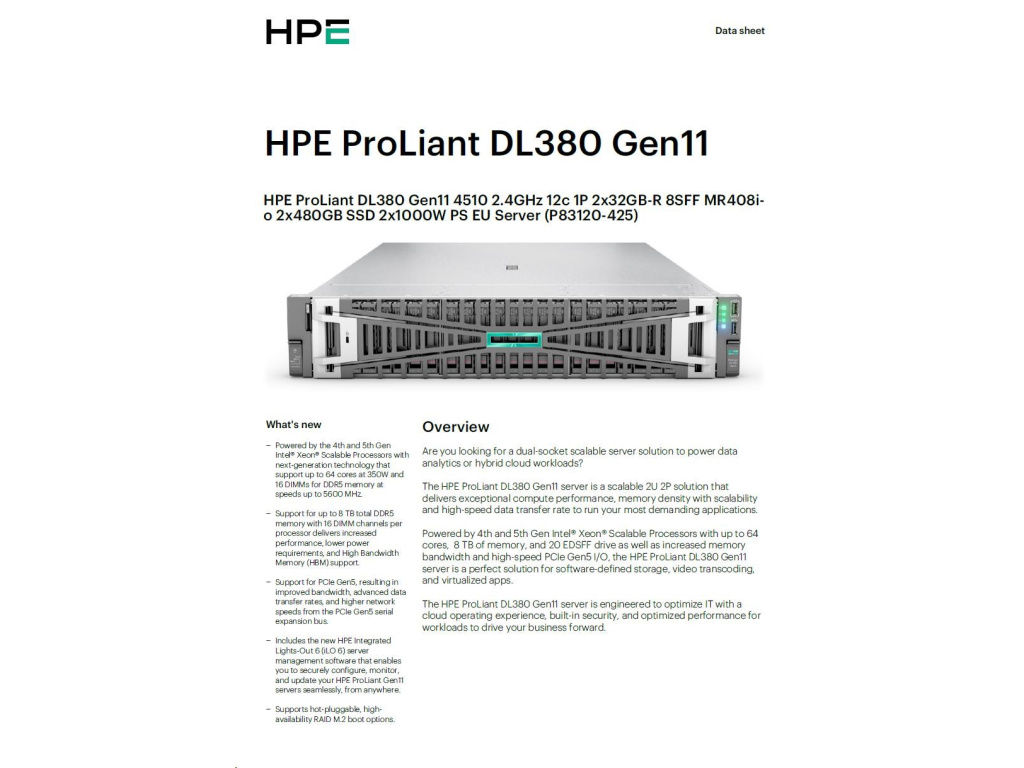 HPE PL DL380g11 4510 (2.4/12C) 2x32G (p64706) 2x480G 8SFF MR408i-o 2x1000W 4p1To Smart ChoiceEAN: 4549821647613