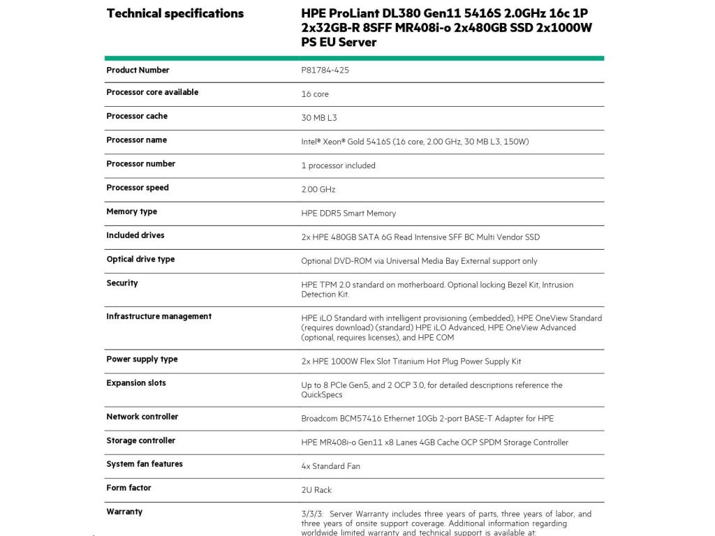 HPE PL DL380g11 5416S (2.0/16C) 2x32G (P43328) 2x480G MR408i-o/4G 8-26SFF 2x1000W 2x10G-T 2U Smart ChoiceEAN: 4549821642144