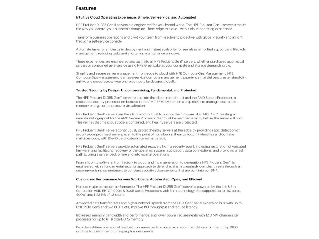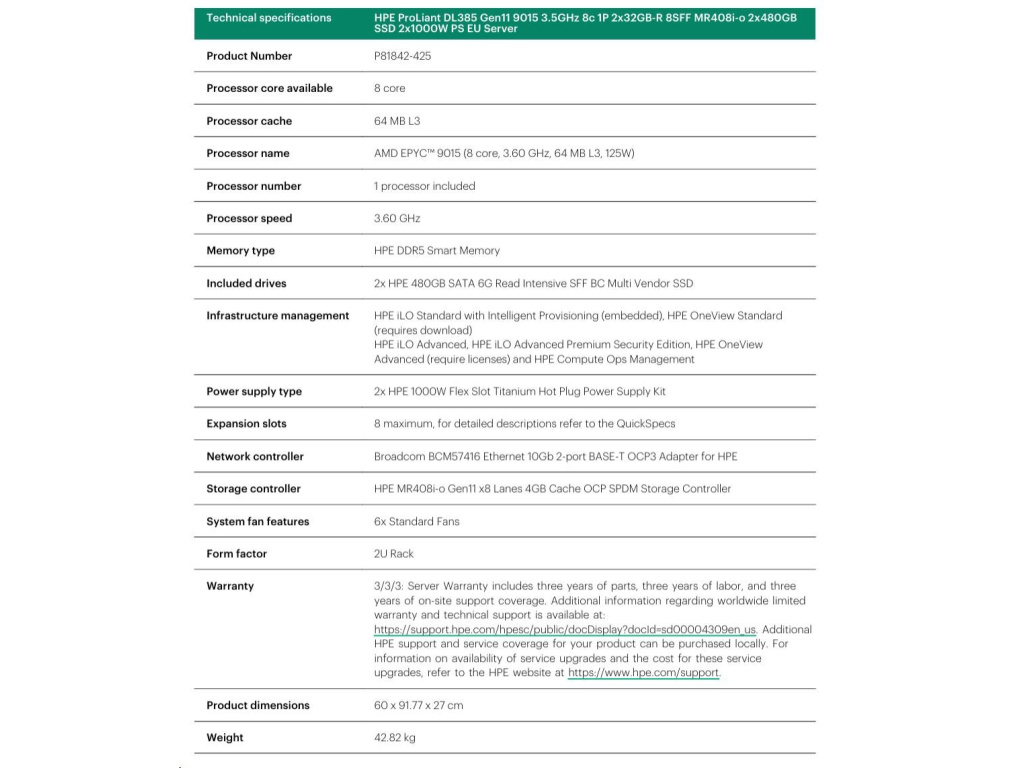 Technical specifications HPE ProLiant DL385 Gen11 9015 2.6GHz 8c 1P 2x32GB-R 8LFF HPE MR408i-o 2p10Tocp 2x1000W PS EU