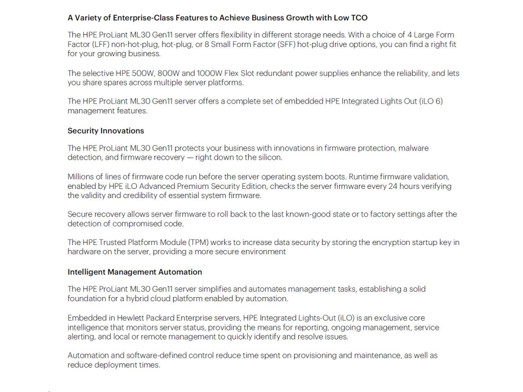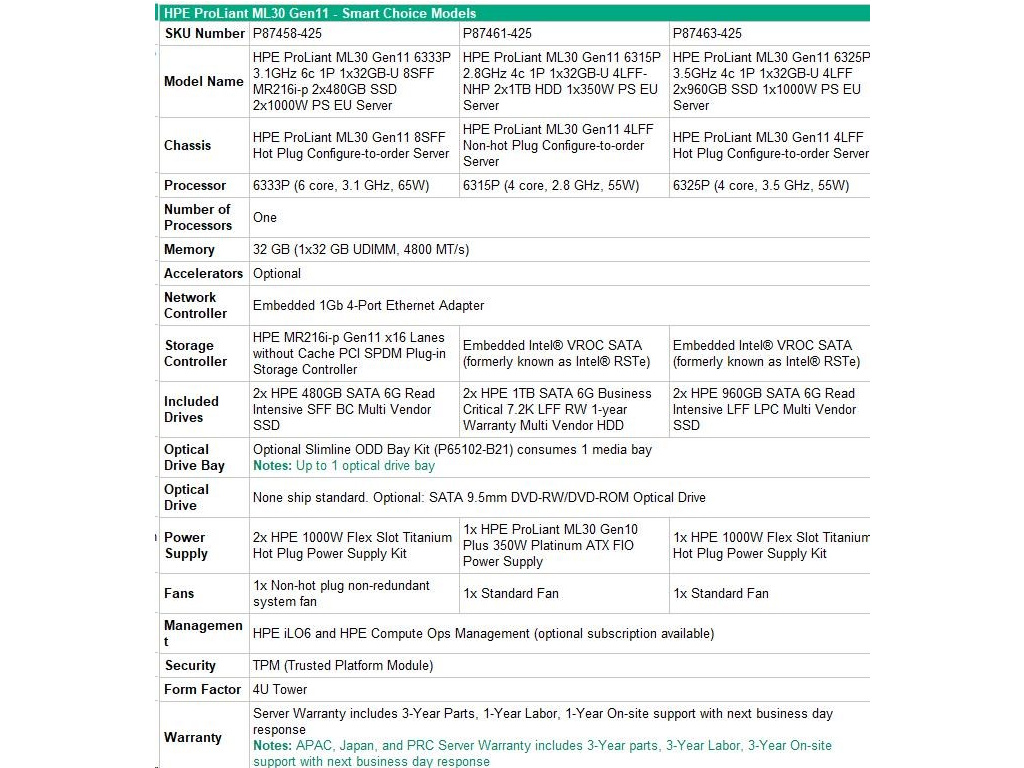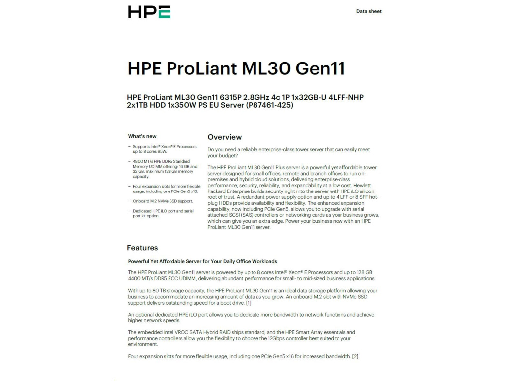 HPE PL ML30g11 6315P (2.8-5.2G/4C4T) 1x32G 2x1TB SATA 4LFF-NHP 1x350 VROC 4p1G NBD311 Smart ChoiceEAN: 4549821660001