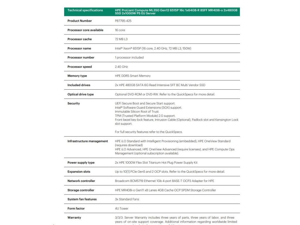 HPE PL ML350 Gen12 6515P (2.4/16C) 1x64G (P69728) 2x480G MR408i-o 8SFF 2x1000W 1GbE NBD333 Smart ChoiceEAN: 4549821660919