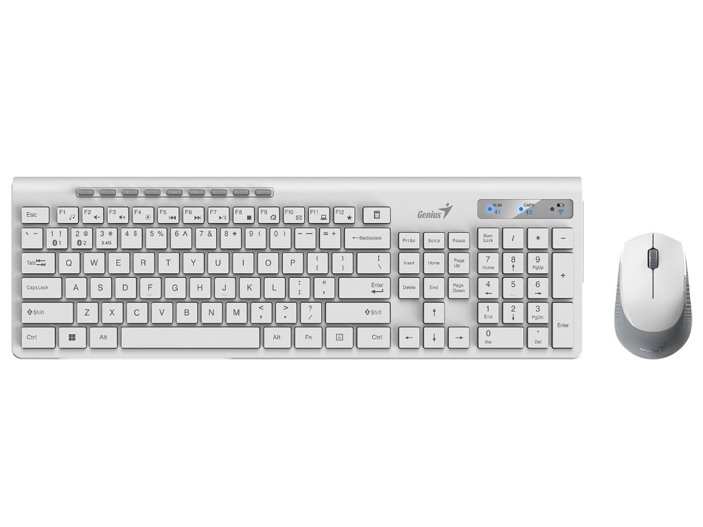 Bezdrátový set klávesnice a myši GENIUS Slimstar 8230 zvládne všechny každodenní úkoly ve firemní kanceláři nebo na home-office. Klávesnice podpoří rychlé a komfortní psaní i velmi náročných a dlouhých dokumentů. Za zmínku stojí také přítomnost multimediální kláves pro základní kontrolu hlasitosti zvuku nebo pozastavení přehrávání. Bezdrátová klávesnice Genius rovněž disponuje numerickým blokem pro zadávání číselných znaků. Bezdrátová myš Genius je vybavena optickým senzorem s rozlišením 1200 dpi, které umožňuje hladký a plynulý pohyb po pracovní ploše a tím přesné ovládání kurzoru. Bezdrátové připojení je realizováno skrze USB adaptér s 2,4GHz rozhraním a Bluetooth a umožní vám činnost až na třech zařízeních současně.