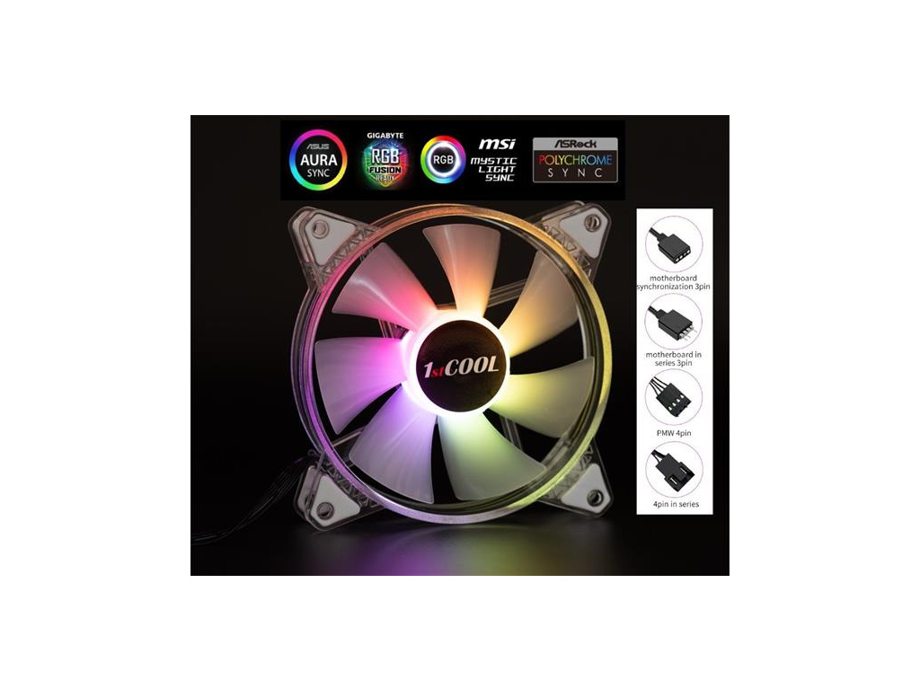 1stCOOL AURA EVO ARGB PWM Crystal 12cm transparentný ventilátor.Prepojovacie konektory: 4pin PWM fan napájanie IN + 4pin PWM OUT + ARGB 3pin IN + ARGB 3pin OUT