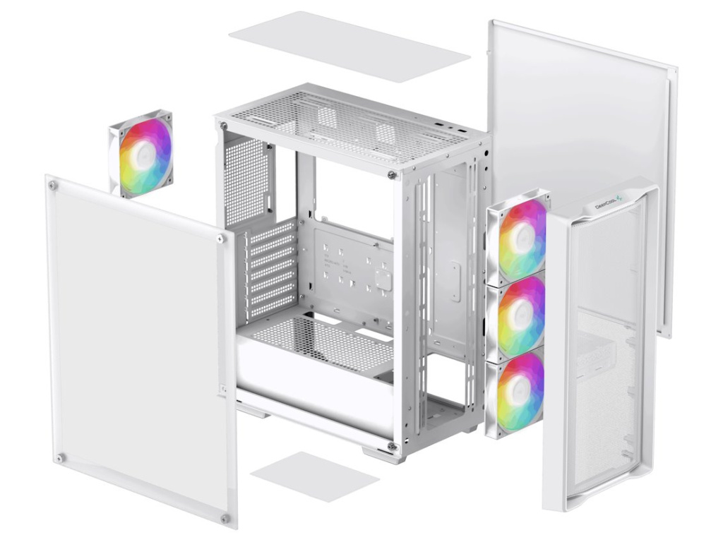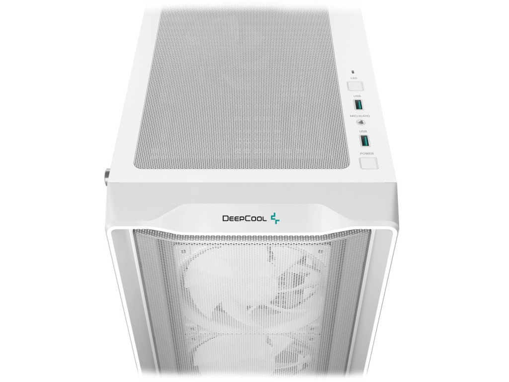 Skříň DEEPCOOL CC560 MESH V2 disponuje také 4 předinstalovanými ventilátory s ARGB podsvícením, které se postarají o efektivní chlazení a stylový vzhled. Na horním panelu se nachází základní ovládání a také konektory pro připojení periferních zařízení.