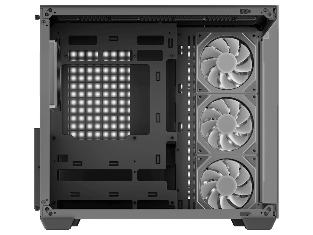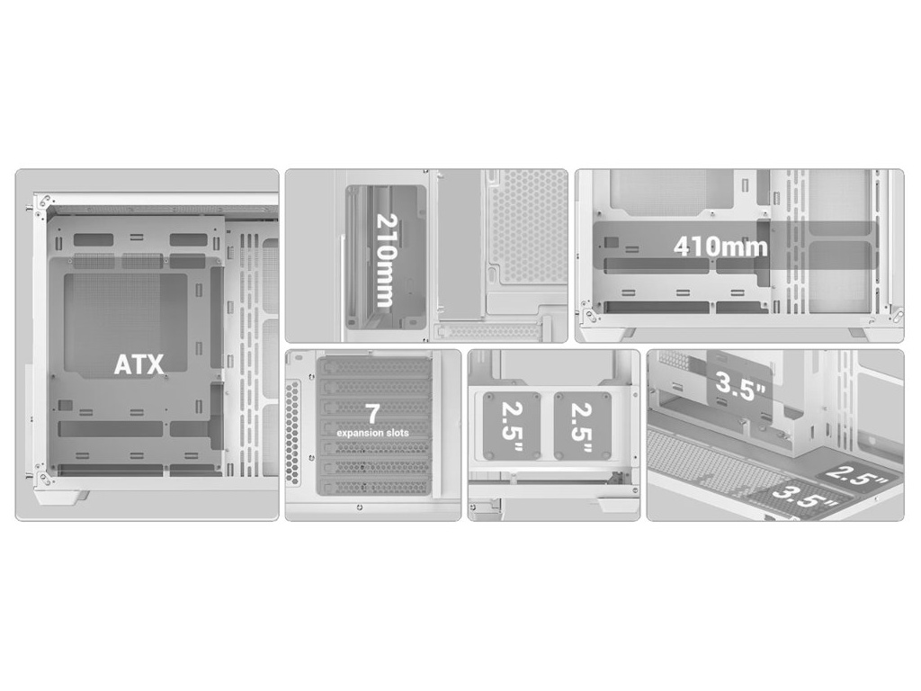 Skříň formátu Middle Tower s průhlednou bočnicí a průhledným předním panelem nabízí tři 2,5" pozice pro SSD disky a dvě 3,5" pozice pro pevné disky. Na horním panelu se nachází dva USB 3.0 porty, jeden USB-C port a kombinovaný port sluchátek a mikrofonu. Skříň je osazena čtyřmi 120mm PWM ventilátory s ARGB podsvícením. Důmyslné řešení umožňuje pohodlné umístění až 360 mm dlouhého výměníku vodního chlazení na vrchní či spodní straně. Ve skříni je dostatek prostoru pro chladič CPU do výšky až 160 mm a grafickou kartu o délce 410 mm. Dodávána je bez zdroje. Díky široké konstrukci s důmyslným dvoukomorovým uspořádáním zajišťuje tato skříň vynikající kompatibilitu a optimální proudění vzduchu. Součástí je také sada prachových filtrů.