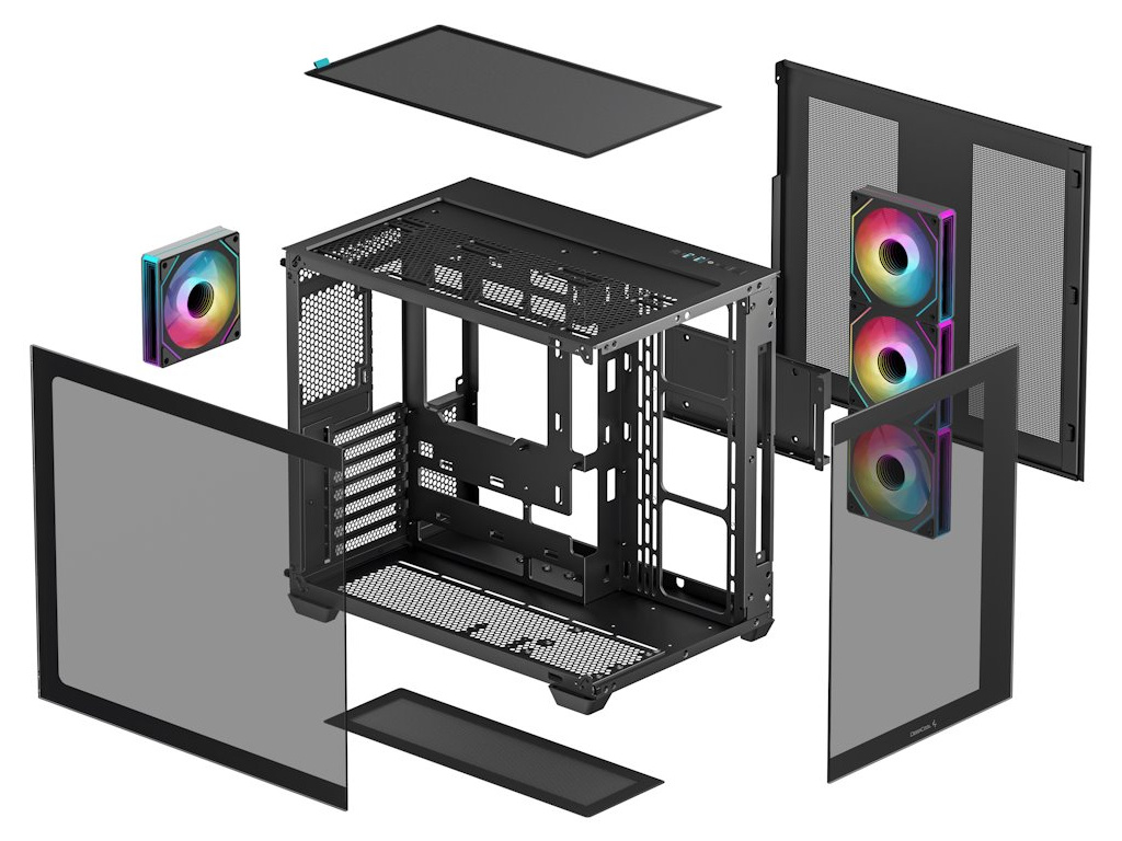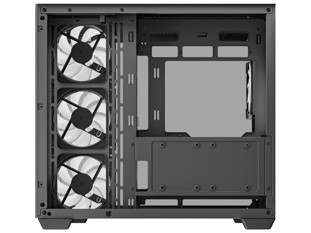 Zdroj napájení nebo disky mají samostatné vzduchové kanály, díky čemuž je zajištěn stabilní provoz i při vysoké zátěži. Pro připojení základní desky zase slouží zadní konektor, čímž je vnitřní uspořádání přehledné a perfektně organizované. Součástí PC skříně DEEPCOOL CG530 4F je čtveřice předinstalovaných ventilátorů s ARGB podsvícením, které dodají celé sestavě dokonalé chlazení i stylový gamingový vzhled. Na horním panelu najdete porty pro připojení periferních zařízení. Samozřejmostí je také přítomnost prachových filtrů pro efektivní ochranu součástek před prachem.