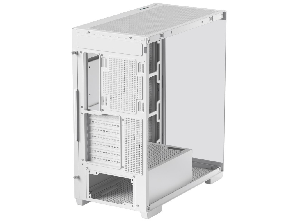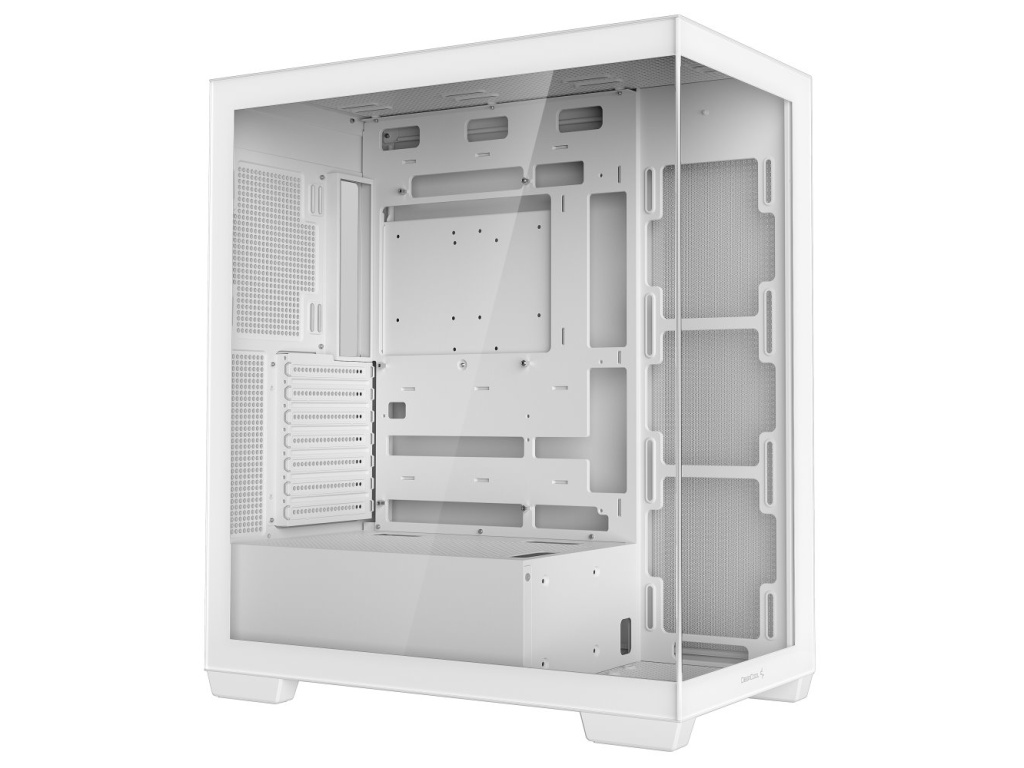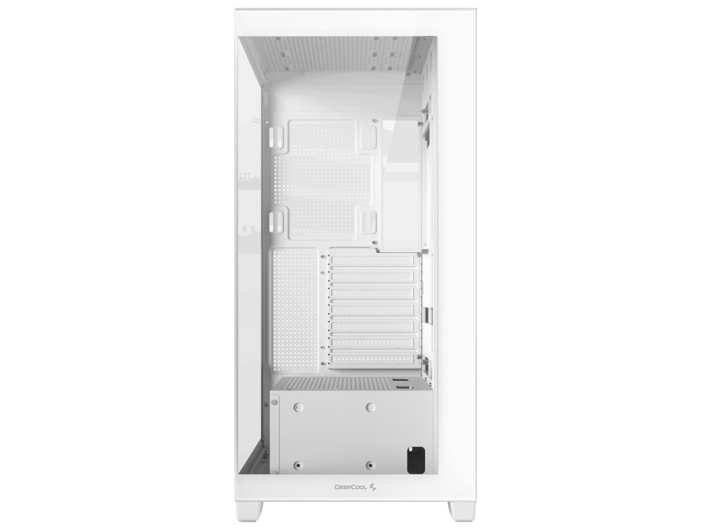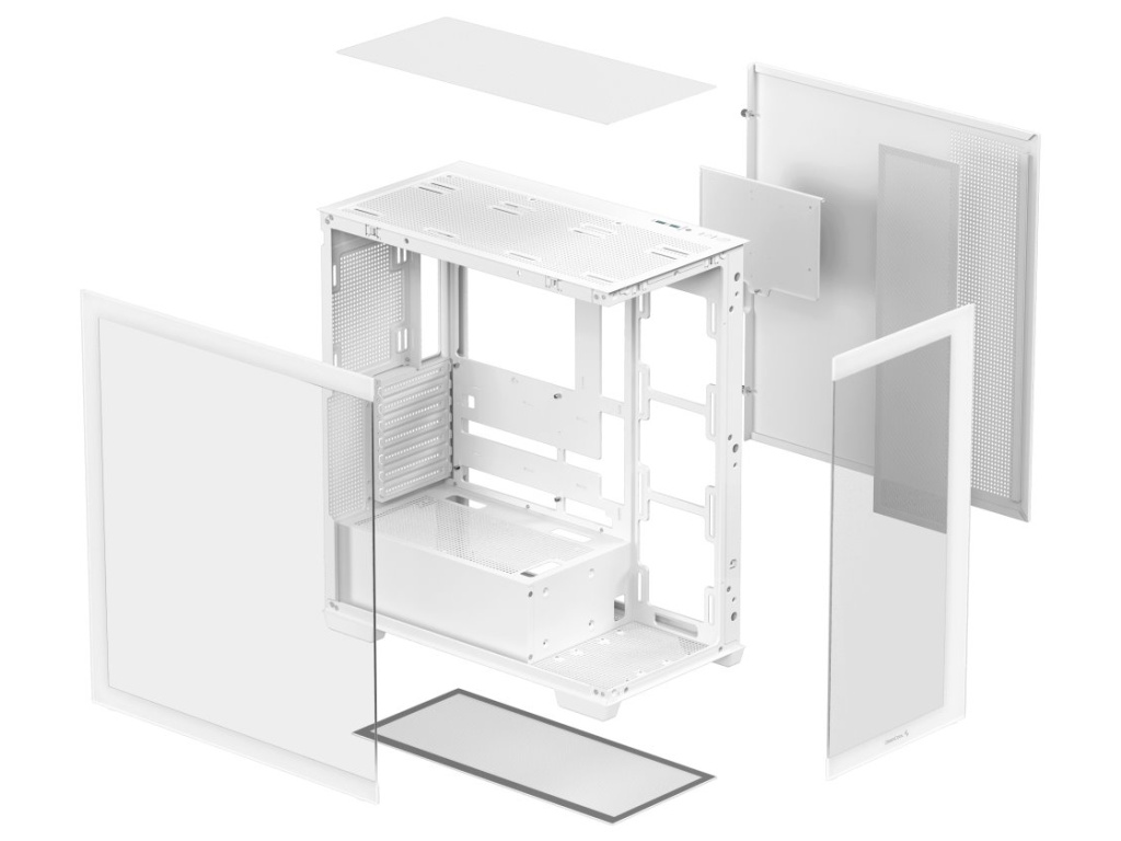 DEEPCOOL CG580Skříň formátu Middle Tower s průhlednou bočnicí a předním panelem nabízí až tři 2,5" pozice pro SSD disky a dvě 3,5" pozice pro pevné disky. Na horním panelu se nachází dva USB 3.0 porty a kombinovaný port sluchátek a mikrofonu. Skříň je dodávána bez ventilátorů, ale nabízí celkem až 10 pozic pro 120mm ventilátor, nebo 6 pozic pro 120mm ventilátor a tři pozice pro 140mm ventilátor. Důmyslné řešení umožňuje pohodlné umístění až 360 mm dlouhého výměníku vodního chlazení na horní nebo boční straně. Ve skříni je dostatek prostoru pro chladič CPU do výšky až 176 mm a grafickou kartu o délce 410 mm (v případě instalace 360mm výměníku vodního chlazení na boční straně max. 262 mm). Skříň je dodávána bez zdroje. Součástí je také sada magnetických prachových filtrů.