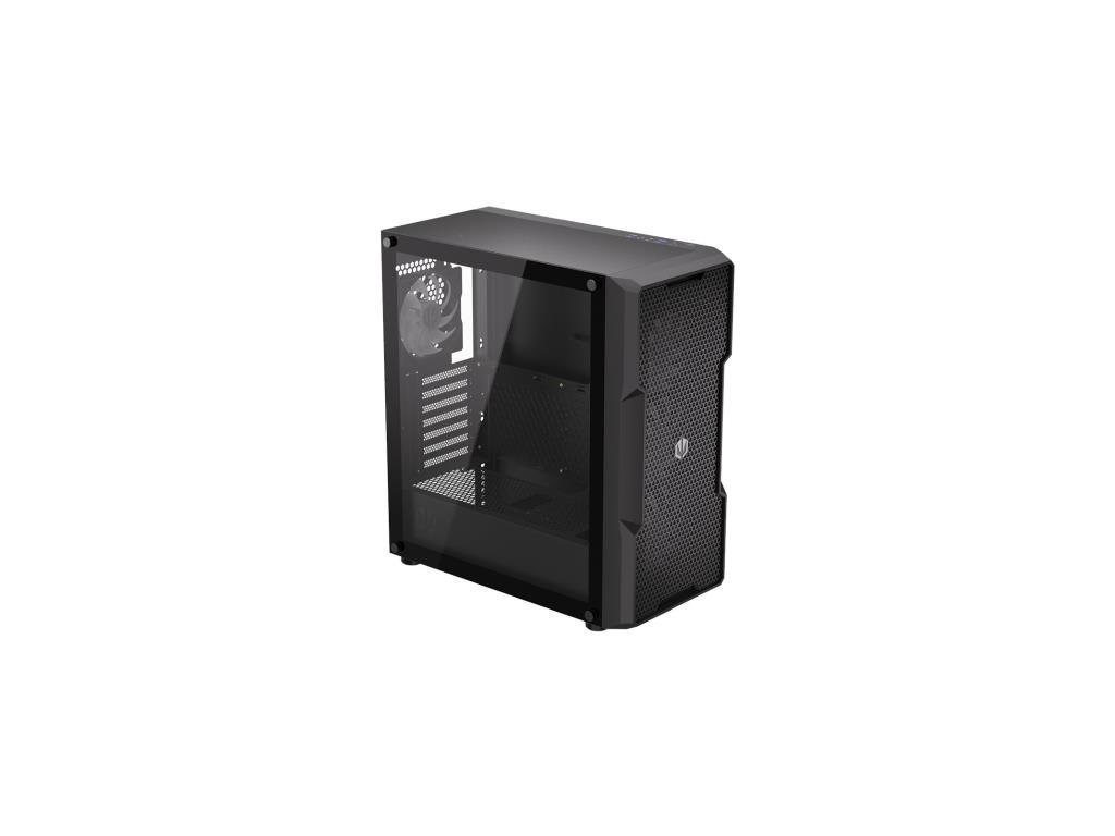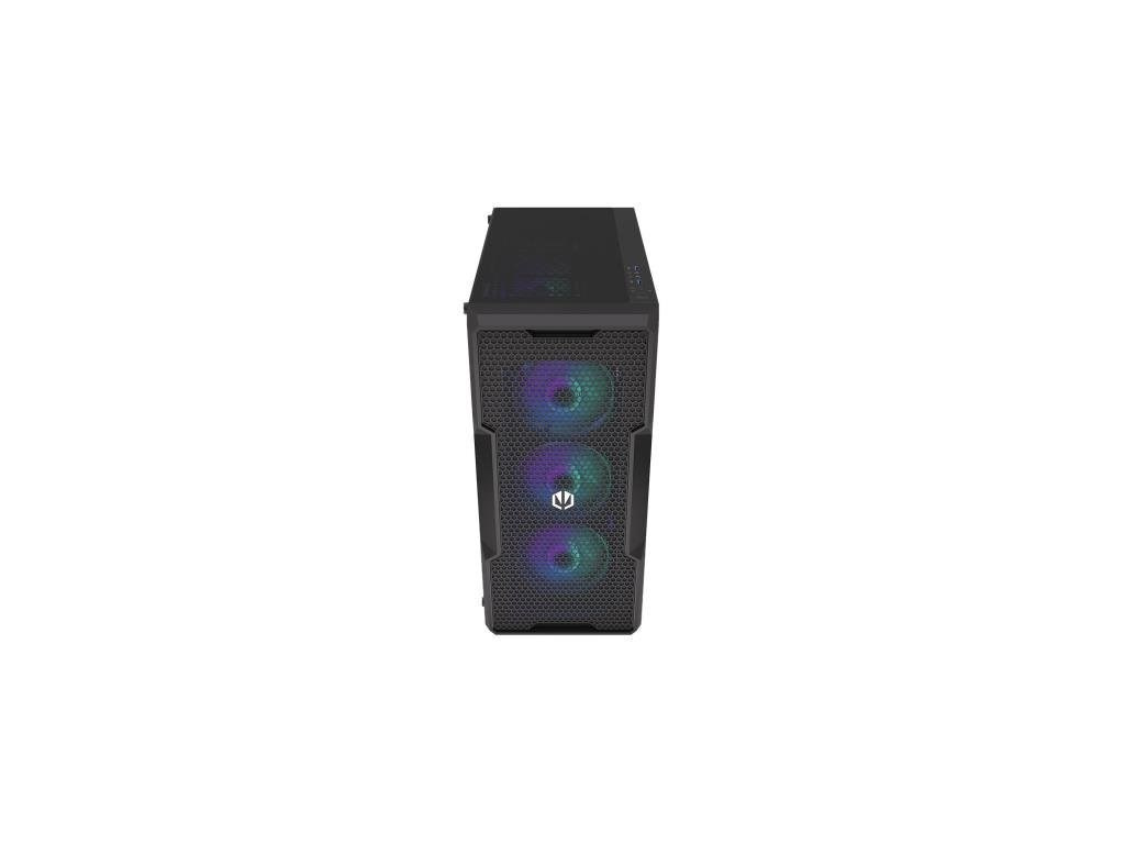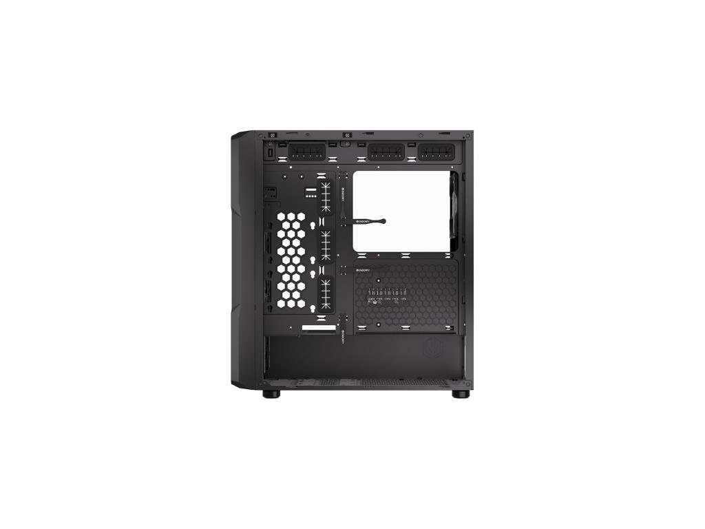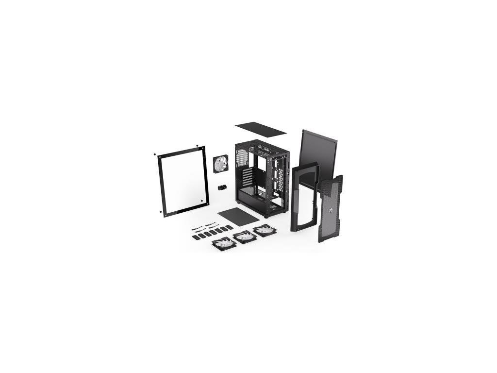 Skříň formátu Middle Tower s průhlednou bočnicí z tvrzeného skla nabízí dvě 2,5" pozice pro SSD disky a dvě 3,5" pozice pro pevné disky. Na horní části se nachází dva USB 3.0 porty, sluchátkový výstup a audio vstup pro mikrofon. Vybavena je čtyřmi 120 mm ventilátory s ARGB podsvícením, které spolu s perforovaným čelním panelem zajišťují dostatečné proudění vzduchu. Důmyslné řešení umožňuje pohodlné umístění až 360 mm dlouhého výměníku vodního chlazení na přední straně. Ve skříni je dostatek prostoru pro chladič CPU do výšky až 162 mm a grafickou kartu o délce až 370 mm. Dodávána je bez zdroje. Součástí je také interní ARGB ovladač a sada prachových filtrů.
