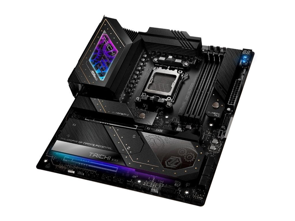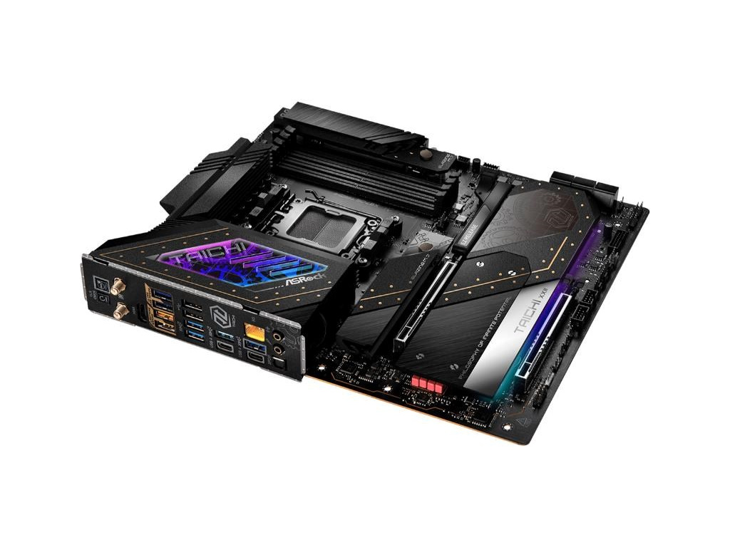 Taichi series flagship motherboard features top-tier hardware spec, robust power design, USB4 Type-C, and DIY-friendly functionality. It's built for high-end gamers, offering luxury aesthetics and powerful performance.
