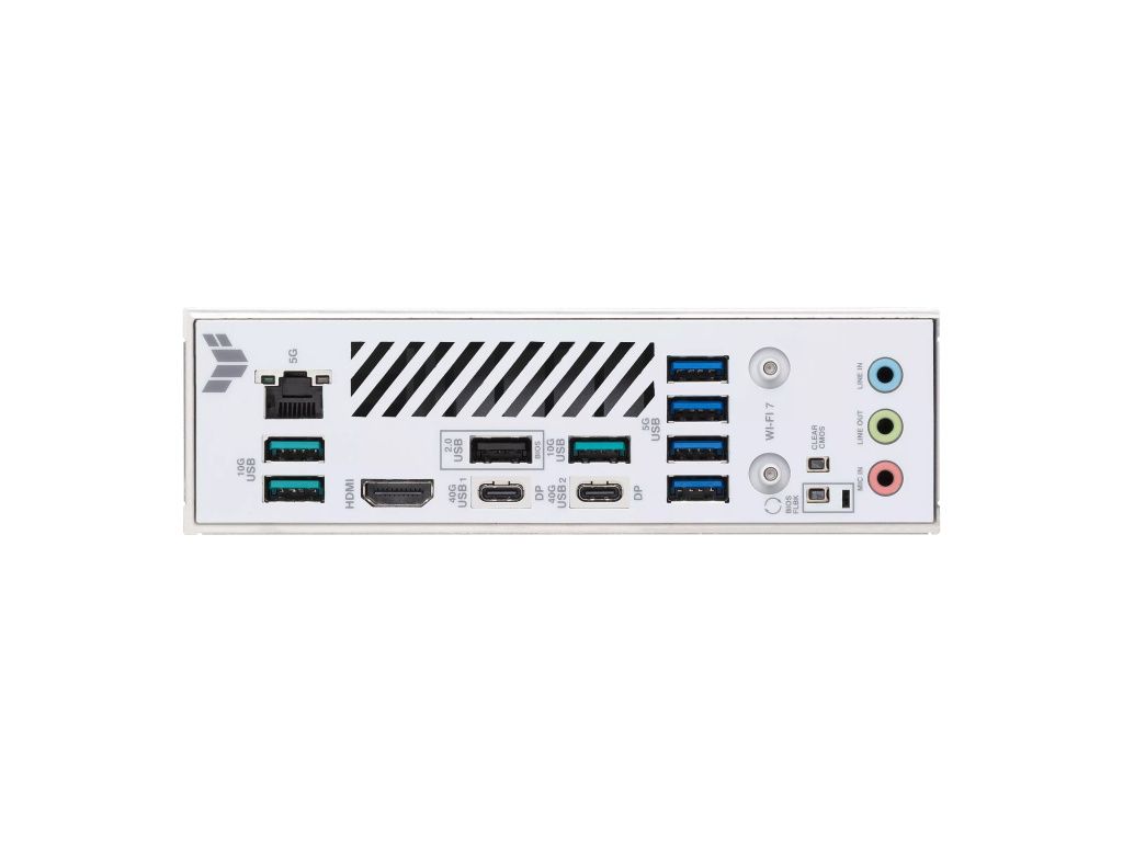 Zadní panel I/O porty: 2 x USB4® (40Gbps) ports (2 x USB Type-C®) 3 x USB 10Gbps ports (3 x Type-A) 4 x USB 5Gbps ports (4 x Type-A) 1 x USB 2.0 port (1 x Type-A) 1 x HDMI™ port 1 x Wi-Fi module 1 x Realtek® 5Gb Ethernet port 3 x Audio jacks 1 x BIOS FlashBack™ button 1 x Clear CMOS button