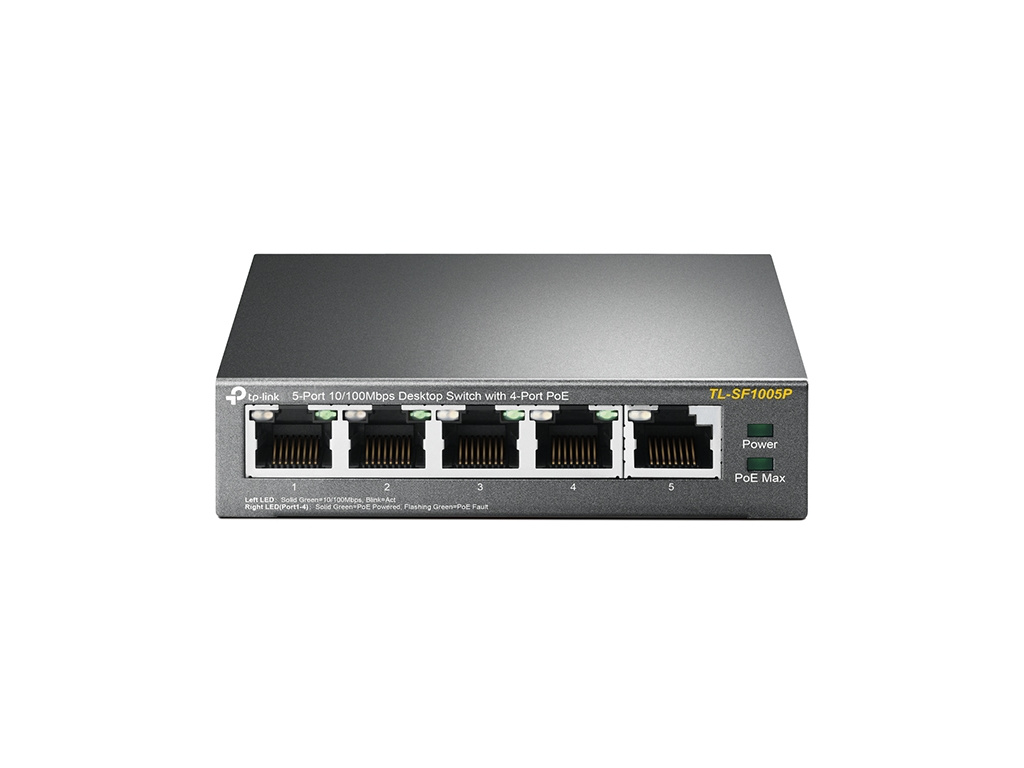 TP-Link TL-SF1005PSwitch TP-Link TL-SF1005P je vybaven pěti porty RJ-45 10/100 Mb/s, z nichž 4 porty dipsonují napájením PoE (Power over Ethernet). Dokáže automaticky detekovat a napájet jakákoli zařízení, která splňují protokol IEEE 802.3af.