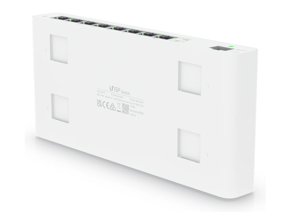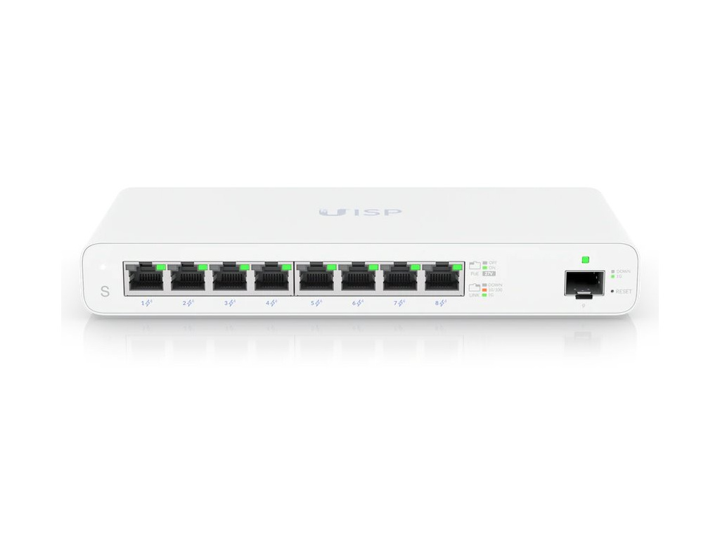 Ubiquiti UISP SwitchUISP Switch je osazen osmi GbE PoE RJ-45 a jedním GbE SFP slotem pro uplink. Jedná se o bezventilátorový L2 přepínač s kapacitou 18 Gbps a rychlostí směrování 13,392 Mpps. Celková napájecí PoE kapacita switche je 110 W. Switch lze navíc upevnit ke zdi, díky přiloženému držáku.