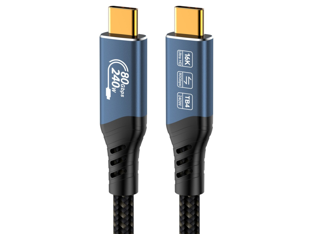 PremiumCord USB4™ Version2.0 80Gbps 16K@60Hz 240W Thunderbolt 3 a 4 kabel 0,8m Tento kabel USB4™ Version2.0 nabízí extrémně vysokou přenosovou rychlost až 80 Gbit/s, takže je ideální pro datově náročné aplikace. Přeneste videa ve vysokém rozlišení až 16K na monitory a televizory, vychutnejte si ostrý obraz a vynikající zvuk. Umožňuje napájet nebo nabíjet až do výkonu 240W. - Kabel vhodný také na propojení monitoru s rozlišením až 16K@60hz, 8K@60hz nebo 4K@120hz - První konektor: USB typ C samec rovný - Druhý konektor: USB typ C samec rovný - Bezkonkurenčních 80 Gbit/s zajišťuje bleskově rychlý přenos dat – kabel USB-C je 16x rychlejší než USB 3.0 a ideální pro pevné disky NVMe, HD filmy, seriály, hudbu a fotografie. - Špičkový výkon díky asymetrickému přenosu dat, podporovanému systémem Windows 11 (sestavení 23615): USB4™ Gen 4 umožňuje rychlost stahování 120 Gbit/s se současnou rychlostí odesílání 40 Gbit/s. - Podporuje rozlišení: 16K/60Hz (15360x8460) Quad UHD, 8K/60Hz (7680x4320) Full UHD, 4K/60Hz (3840x2160) UHD, HDR - Dosud nejflexibilnější USB kabel, umožňuje tunelování dat z DisplayPort™ 2.1 a PCIe™ 4.0 a lze jej připojit přímo k portům s Thunderbolt™ 4 nebo Thunderbolt 3™ - Napájení 48V / 5A ( Napájení PD3.1, výkon napájení až 240W ) - Podporuje rychlonabíjení USB Power Delivery PD 2.0 / PD 3.0 , 240W (48V/5A) - Podporuje rychlonabíjení QC 2.0 / QC 3.0 / QC4+: Qualcomm Quick Charge - Rozlišení videa 16K@60Hz, až 80Gbps (podporuje DisplayPort Alt Mode 2.0) - Podporuje HDR10 a je ideální pro streamování HD videa na externí monitory, televizory nebo projektory, např. z chytrých telefonů, notebooků, tabletů a dalších hostitelských zařízení - USB4™ je kompatibilní s high-end herními komponenty, např. Razer Blade 18, Corsair Voyager, Apple Studio Display nebo procesory AMD Ryzen (Zen 3+, Zen 5) - Zalévané konektory v hliníkovém pozdře zaručují dokonalou pevnost a stabilitu - Chipset: EJ903C/U - E-Marker pro USB-C kabely - Koaxiální měděné vnitřní vodiče umožňují vysoký datový přenos - Materiál pláště TPE, který kombinuje vlastnosti gumy a PVC a vyniká ohebností a velkou pevností - Trojité stínění - Kabel potažen jemným bavlněným potahem - Barva kabelu: černá - Hliníkové konektory barvy: modrá s potiskem - Balení PVC sáček s etiketou a EAN kódem - Délka: 0,8mEAN: 8592220026929