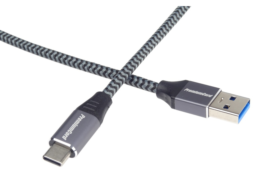 PremiumCord kabel USB-C - USB 3.0 A (USB 3.1 generation 1, 3A, 5Gbit/s) 1m bavlněný oplet a kovové hliníkové konektory