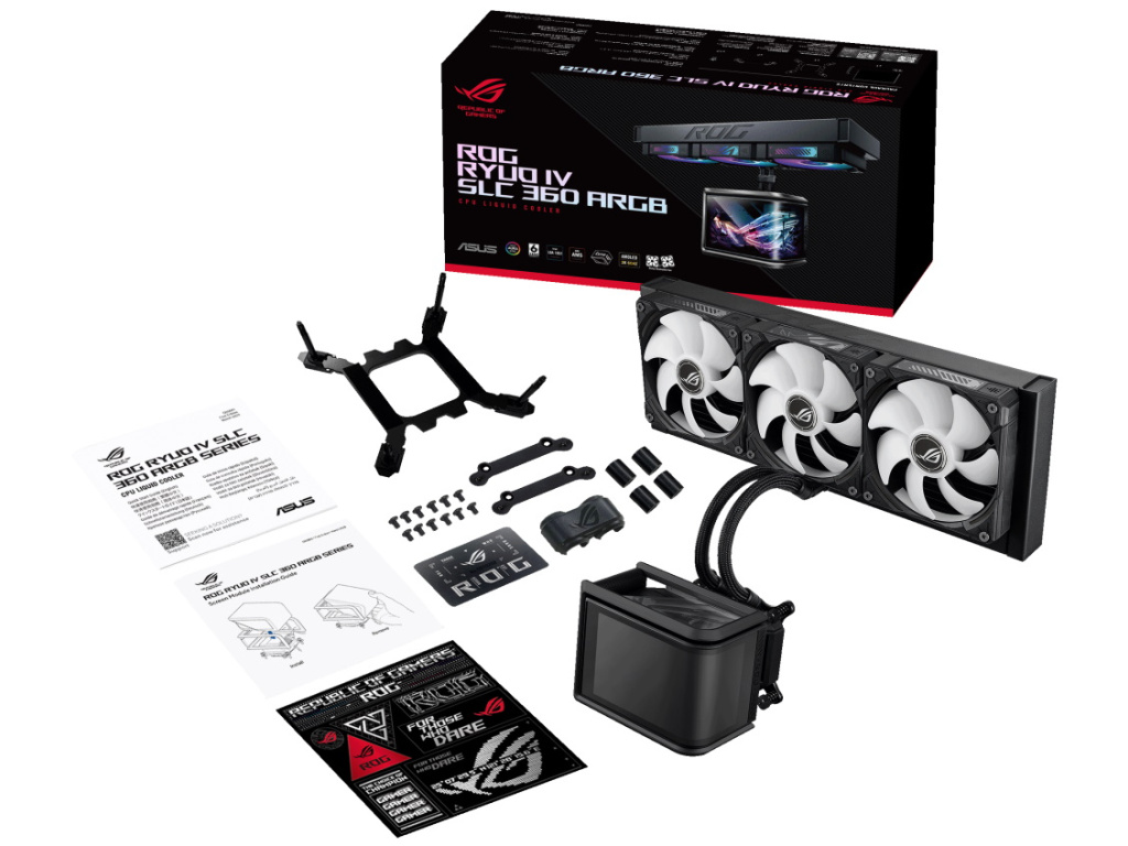 Předinstalované propojené ARGB ventilátory umožňují napájení osvětlení a motoru jediným kabelem. Balení obsahuje kompletní montážní příslušenství pro všechny podporované sockety, ROG VIP kartu a samolepku.