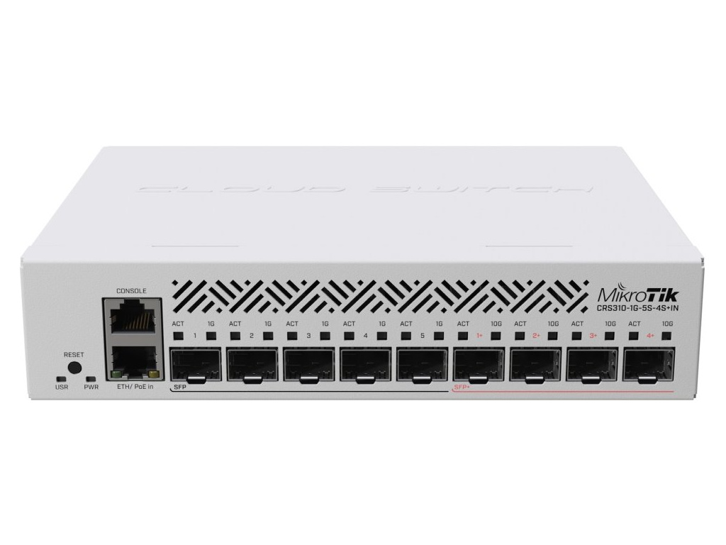 MikroTik Cloud Router Switch CRS310-1G-5S-4S+INVýkonný Cloud Router Switch se čtyřmi 10G SFP+, pěti 1G SFP sloty a jedním GbE RJ-45 portem. Switch poskytuje 10Gigabitové optické připojení na více než 100 metrů, a je tak ideálním řešením jak pro poskytovatele internetu, tak i pro firmy.