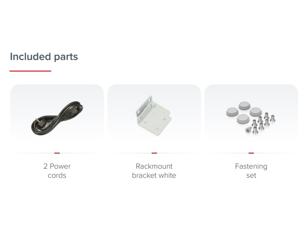 Balení obsahuje: Cloud Core Router CCR2004-16G-2S+ určený pro montáž do racku (1U), dva napájecí kabely a rackmount kit.