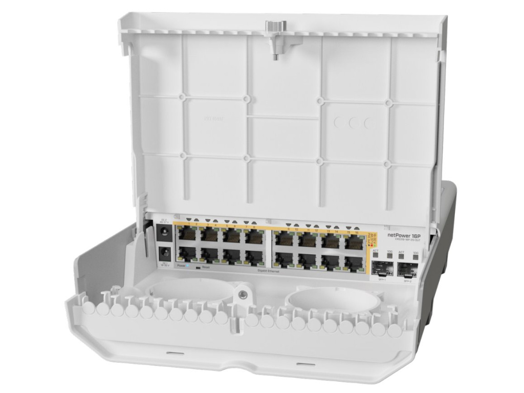 MikroTik netPower 16P (CRS318-16P-2S+OUT)Venkovní 18portový switch s 16 PoE porty a 2 SFP+ porty. Velkou předností je duální systém RouterOS/SwitchOS (Licence level 5). Robustní a kompaktní venkovní kryt umožňuje montáž do všech typů prostředí. Napájení skupiny přístupových bodů nebo IP kamer nebylo nikdy snazší.