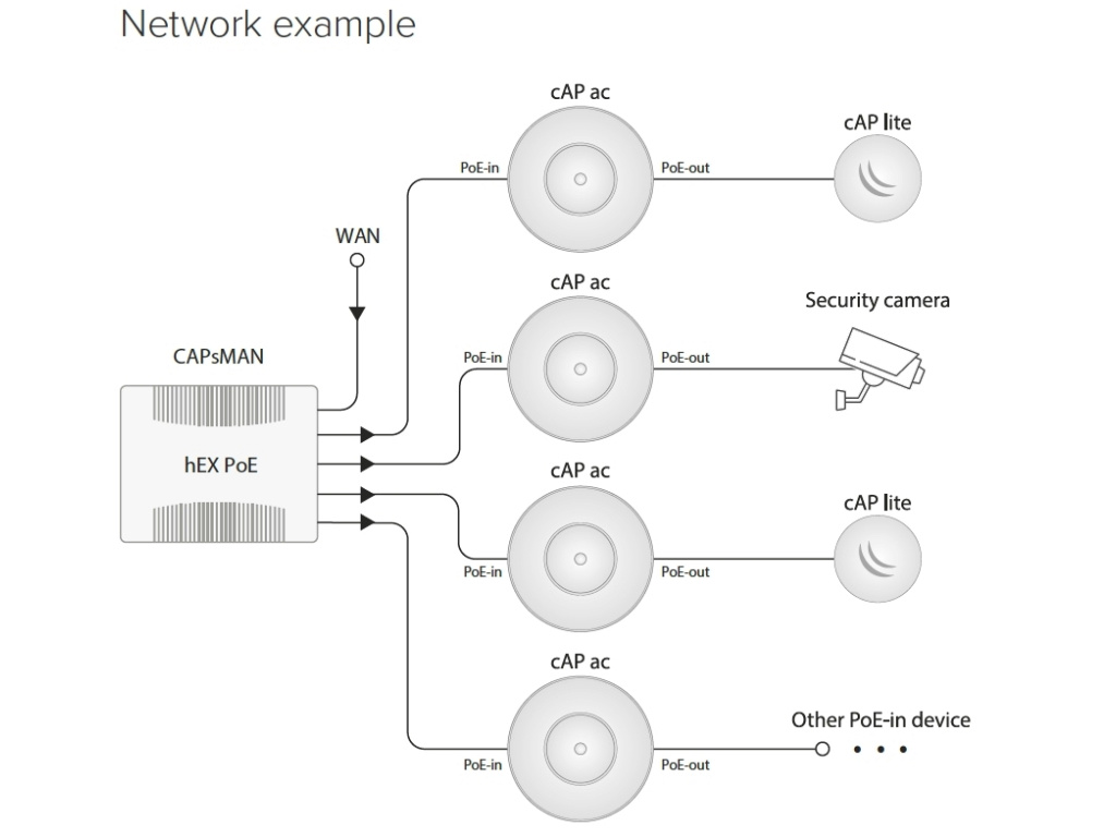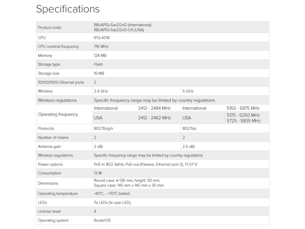 Popis produktu RBcAPGi-5acD2nD / cAP ac (stropní Access Point) je stropní dual band AP od MikroTiku s modulačními rychlostmi 300 Mbps (2.4GHz) a 866Mbps (5GHz). Navrženo bylo tak, aby maximálně splynulo s místem instalace, ideální pro hostinské činnosti, jako restaurace, hotely, letiště, nákupní centra, atd... cAP ac podporuje 802.11a/b/g/n/ac a může být napájeno pomocí pasivního PoE. Je to ideální zařízení pro MikroTik CAPsMAN (řízený správce AP systému), který umožňuje ovládat všechna AP zařízení z jednoho centrálního místa. Narozdíl od tradičního řídicího softwaru, který vyžaduje samostatné PC, CAPsMAN běží na existujícím RouterBOARD zařízení ve vaší síti! PoE Out Oproti ostatním cAP jednotkám má tento model 2 ethernetové porty s podporou PoE. PoE IN na prvním portu podporuje napájení jak pomocí aktivních norem 802.3af/at, tak i pasivního napájení 17 až 57V DC. Druhý port s funkcí PoE Out může napájet další zařízení se stejným napětím jako na prvním portu, ovšem pouze pomocí pasivního PoE. Obsah balení Zařízení Napájecí adaptér 24V/1.2A Gigabitový PoE injektor Montážní sada k přichycení na strop/zeď Technické parametry Bezdrátové vlastnosti Vysílací výkon [dBm]:26 Bezdrátové frekvence:2.4 + 5 GHz (dual band) WiFi standardy:802.11ac, 802.11n, 802.11a, 802.11b/g Přenosová rychlost - 5GHz [Mb/s]:866 Přenosová rychlost - 2.4GHz [Mb/s]:300 2.4GHz MIMO:2 x 2 5GHz MIMO:2 x 2 Typ antény:Vestavěná Zisk antény [dBi]:2,5 Konektory a rozhraní Rychlost LAN:(2) 10/100/1000Mbps Gigabit LAN:Ano Napájení Napájení přes PoE:802.3af, 802.3at, 17 .. 57V DC Typ napájení:PoE Typy PoE:PoE-Out + PoE-In Počet PoE Out portů:1 Max. spotřeba energie [W]:13 Fyzické charakteristiky Provedení:Na zeď Provozní teplota [°C]:-40 až 70 Šířka [mm]:136 Výška [mm]:30 Hloubka [mm]:136 Hardware CPU:IPQ-4018 Počet CPU jader:4 Interní uložiště [MB]:16 RAM [MB]:128 Software Operační systém:RouterOS - L4 Výchozí IP adresa:192.168.88.1 Výchozí jméno a heslo:admin / -EAN: 2231079513421