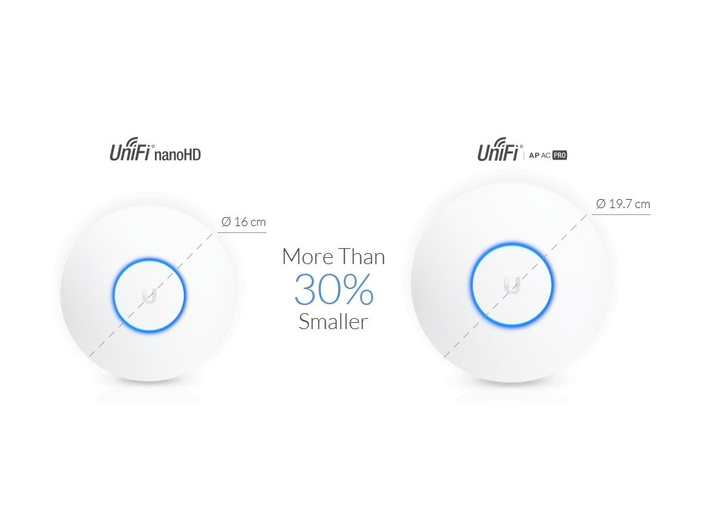 Popis produktu Zařízení je součástí kompletní řady výrobků UniFi, podporuje standardy 802.11a/g/b/n/ac/ac-wave2, kdy používá jak pásmo 2.4 GHz, tak i 5 GHz a to s modulačními rychlostmi 300Mbps a 1733Mbps. K podpoření výkonu bezdrátové části je UAP vybaveno jedním Gigabit ethernetovým portem, který je kompatibilní s PoE standardem 802.3af. Maximální výkon 2.4GHz radiové části je 23dBm a 26dBm v pásmu 5GHz. Šifrování pomocí WPA2 je dnes již samozřejmostí. Výhody MU-MIMO technologieDíky MU-MIMO (Multiple User - Multiple In - Multiple Out) technologii je UAP-nanoHD schopno komunikovat s několika zařízeními ve stejný čas: 4 klienti 1x1 2 klienti 2x2 1 klient 2x2 + 2 klienti 1x1 1 klient 3x3 + 1 klient 1x1 Volitelné šasi Jako první z rodiny UniFi bude mít tento model volitelné šasi, které bude možné dokoupit a bude na výběr z celkem 6ti různých vzorů - mramor, matná černá, beton, dřevo, tkanina a vojenské maskování. Velmi malé rozměry UAP-nanoHD je nejmenší přístupový bod UniFi. Je o 30% menší než verze UAP AC Pro a přibližně stejně veliký jako UAP-AC-Lite. Komlpexní řídící SW pro všechny produkty UniFi K zařízení je potřeba stáhnout z oficiálních stránek originální software nazývaný UniFi controller, díky kterému lze řídit celou síť. Nespornou výhodou UniFi controlleru je, že je zcela zdarma bez jakéhokoliv omezení! Tento centrální management umožní nahrávat mapy a nastavit základní parametry jako například SSID, guest účet, úvodní stránku, statistiky provozu i seznam a status asociovaných klientů vždy snadno a rychle. Výhody UniFi řešení Zero Handoff Roaming - bezvýpadkový přechod mezi jednotlivými AP Wireless uplink (hodí se tam, kam není možné dostat datový kabel) Až 4 SSID Detailní statistiky provozu Guest síť Voucher system Load balance - udržování rovnoměné zátěže / přepínání klientů Omezování rychlosti pro každé SSID Obsah balení (3) Zařízení (3) Montážní úchyty na strop a zeď (3) Sada šroubků a hmoždinek Technické parametry Bezdrátové vlastnosti Bezdrátové frekvence: 2.4 + 5 GHz (dual band) Přenosová rychlost WiFi - 2.4GHz [Mb/s]: 300 Přenosová rychlost WiFi - 5GHz [Mb/s]: 1733 WiFi standardy: 802.11ac, 802.11n, 802.11a, 802.11b/g Vysílací výkon 2.4GHz [dBm]: 23 Vysílací výkon 5GHz [dBm]: 26 Šifrování: WEP, WPA, WPA2 2.4GHz MIMO: 2 x 2 5GHz MIMO: 4 x 4 Typ antény: Vestavěná Počet vestavěných antén: 4 Zisk antény [dBi]: 3 Fyzické charakteristiky Použití: Vnitřní Tlačítka: Reset Provozní teplota [°C]: -10 až 70 Hmotnost [g]: 300 Hloubka [mm]: 160 Šířka [mm]: 160 Výška [mm]: 33 Konektory a rozhraní Rychlosti LAN: (1) 10/100/1000Mbps Gigabit LAN: Ano Napájení Max. spotřeba energie [W]: 10,5 Napájení přes PoE: 802.3af, 48V DC Typy PoE: Vstupní Software Operační mód: Access Point Podpora IPv6: Transparentní (režim bridge) Výchozí IP adresa: Dynamická z DHCP Výchozí jméno a heslo: ubnt / ubntEAN: UAP-NANOHD-3