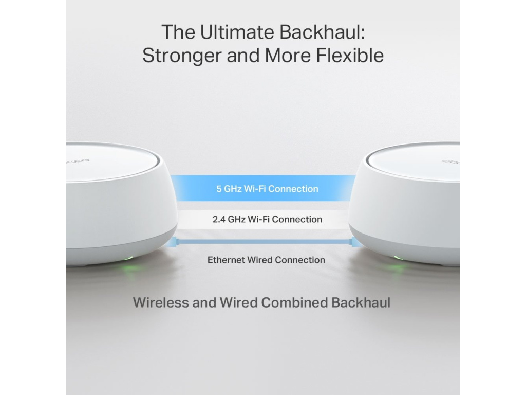 Díky vlastní vyvinuté technologii dokáže Deco BE25 připojit bezdrátový a kabelový backhaul ke každé jednotce současně. Díky nejnovější Wi-Fi 7 MLO technologii se navíc zvyšuje rychlost kombinované agregace bezdrátového a kabelového backhaulu systému. Tím se výrazně zlepšuje celková propustnost a snižuje latence, což přináší širší pokrytí se stabilnějším a spolehlivější připojením.