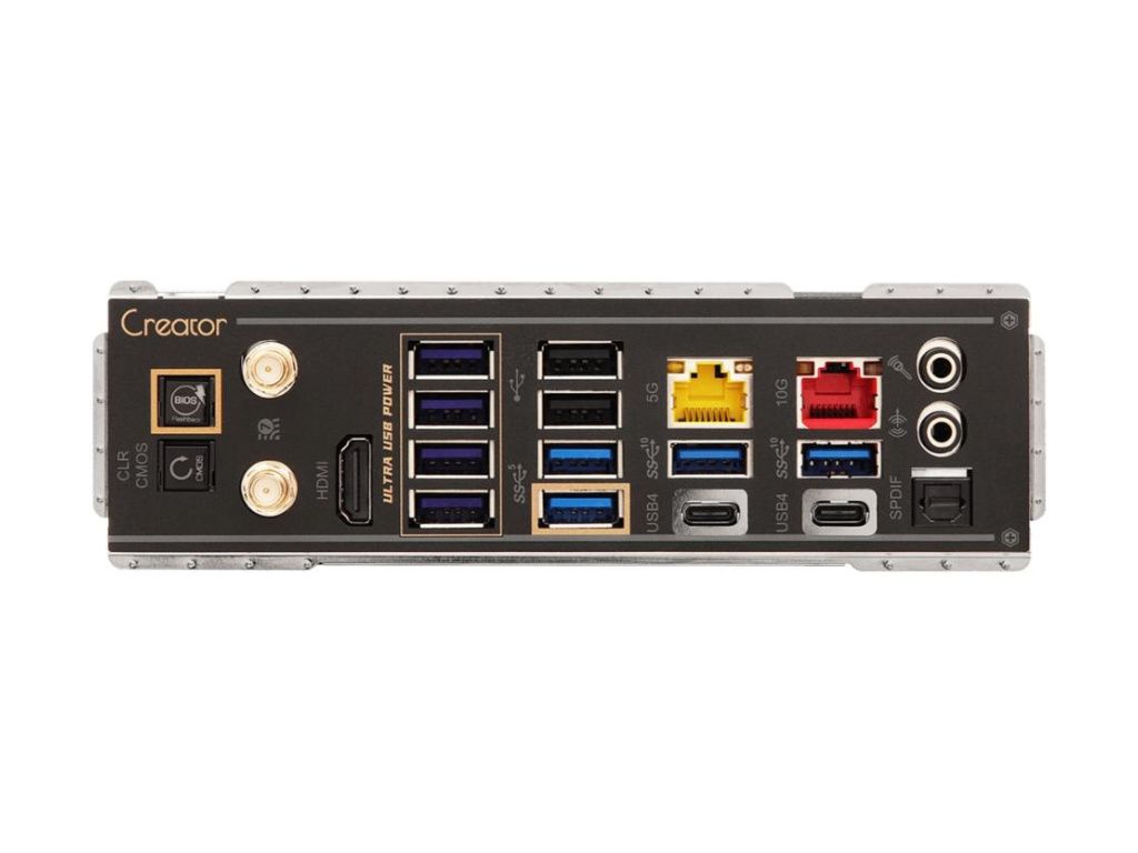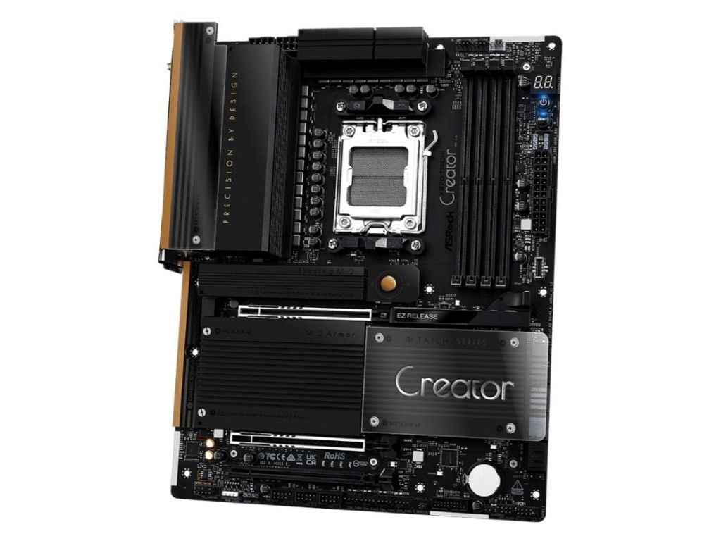 The X870 Taichi Creator features 10GbE and 5GbE LAN, dual USB4 Type-C, dual Gen5 M.2 slots, and dual PCIe 5.0 x16 slots with extra spacing for dual-GPU setups.
