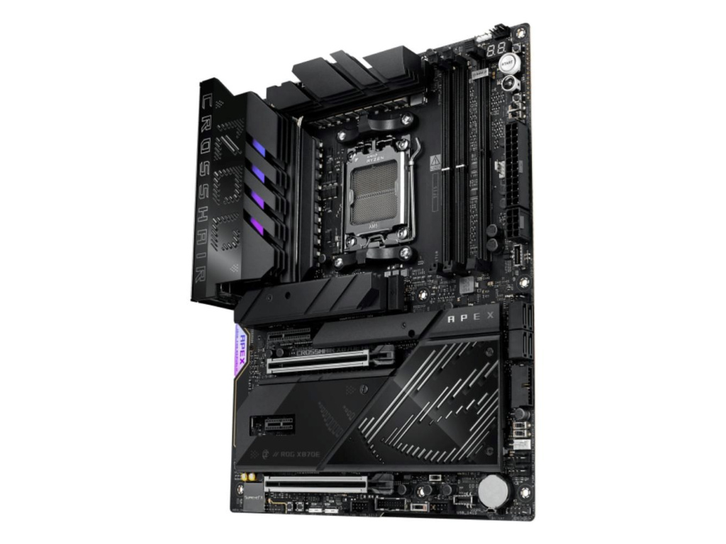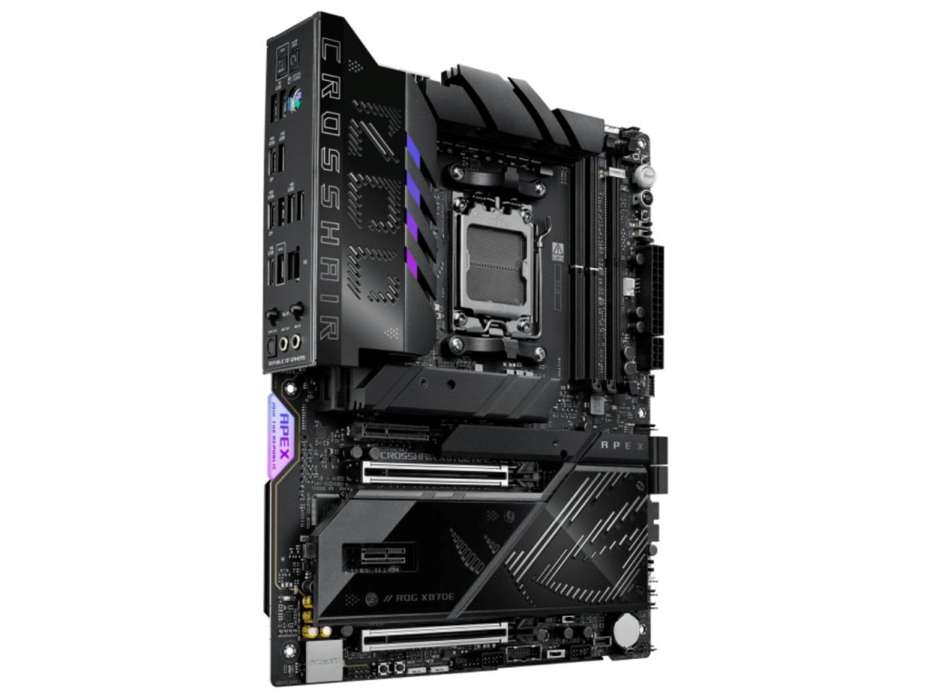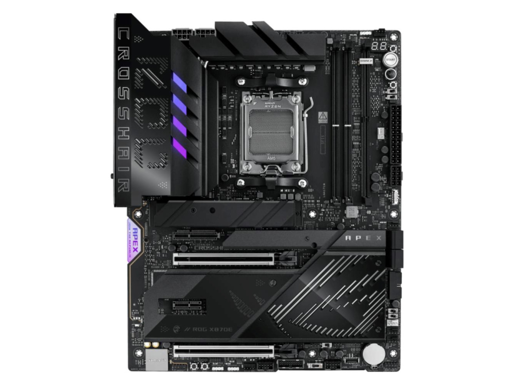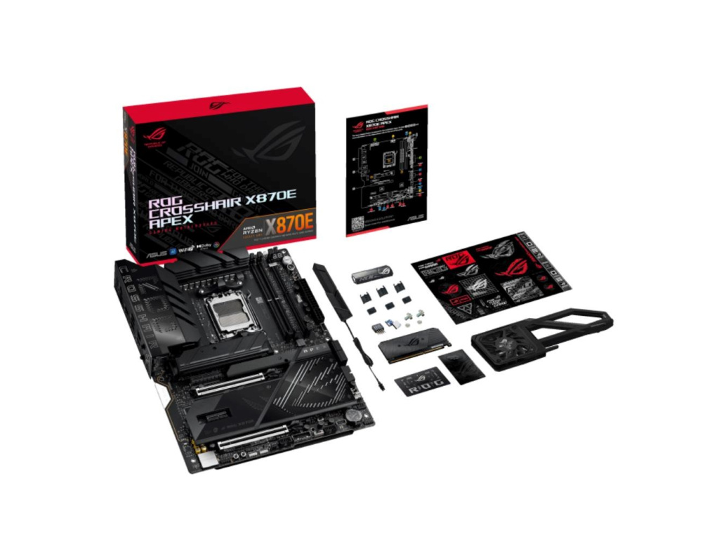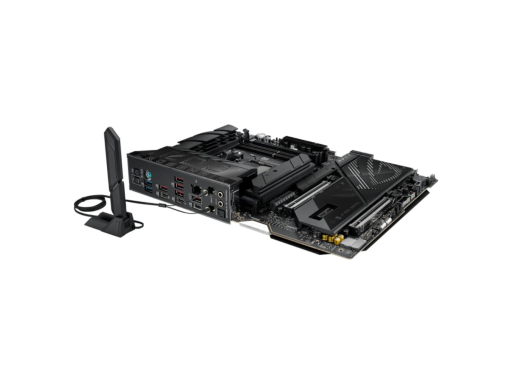 AMD X870E (AM5 Socket) ATX motherboard, Advanced AI PC-ready, 18+2+2 power stages, Dynamic OC Switcher, Core Flex, DDR5 slots with AEMP, ROG Memory Fan Kit for DDR5 overclocking, Wi-Fi 7 with ASUS WiFi Q-Antenna, three PCIe 5.0 M.2 slots onboard, two PCIe 4.0 slots on an ROG DIMM.2 card, PCIe 5.0 x16 SafeSlots with PCIe Slot Q-Release Slim and full support for next-gen graphics cards, two USB4 ports, two USB 20Gbps Type-C front-panel connectors (one with Quick Charge 4+ up to 60W and USB Wattage Watcher), AI Overclocking, AI Cooling II, and AI Networking II