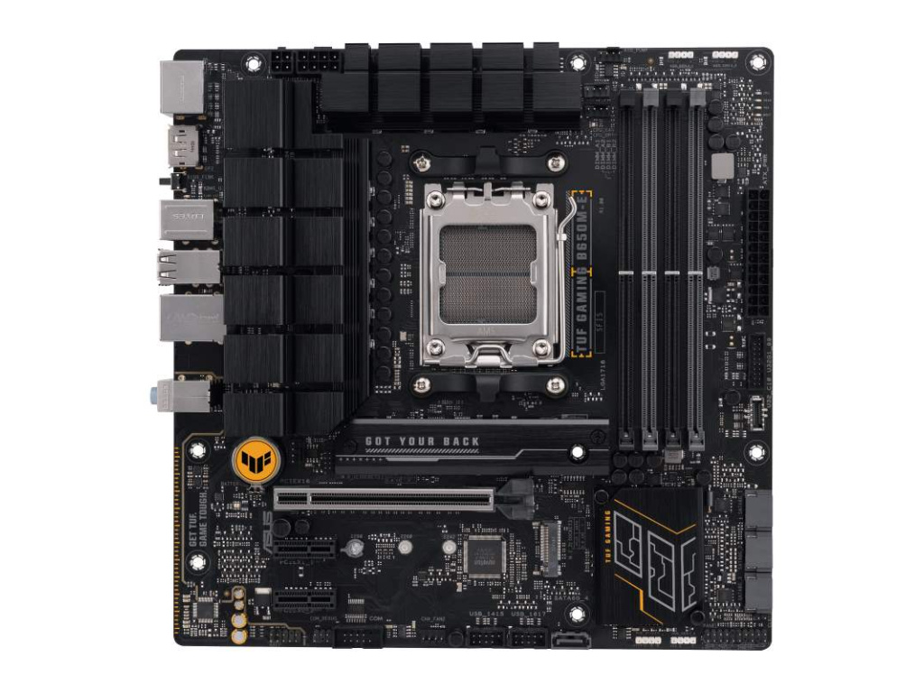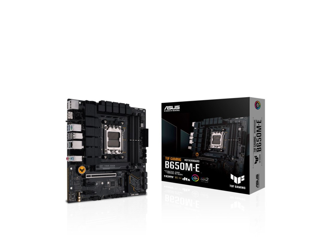 AASUS TUF GAMING B650M-E takes all the essential elements of the latest AMD Ryzen 7000-series processors and combines them with game-ready features and proven durability. Engineered with military-grade components, an upgraded power solution and a comprehensive cooling system, this motherboard goes beyond expectations with rock-solid and stable performance for marathon gaming. TUF GAMING motherboards also undergo rigorous endurance testing to ensure that they can handle conditions where others may fail. Aesthetically, this model incorporates rugged off-black and geometric design elements to reflect the dependability and stability that defines the TUF GAMING series.