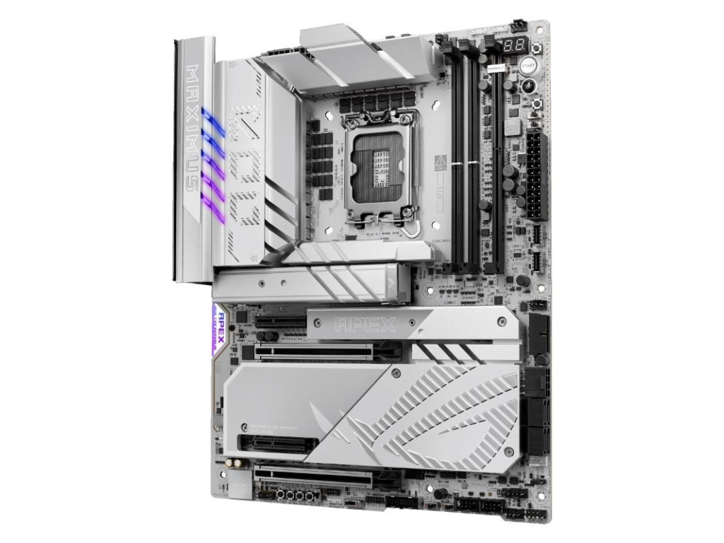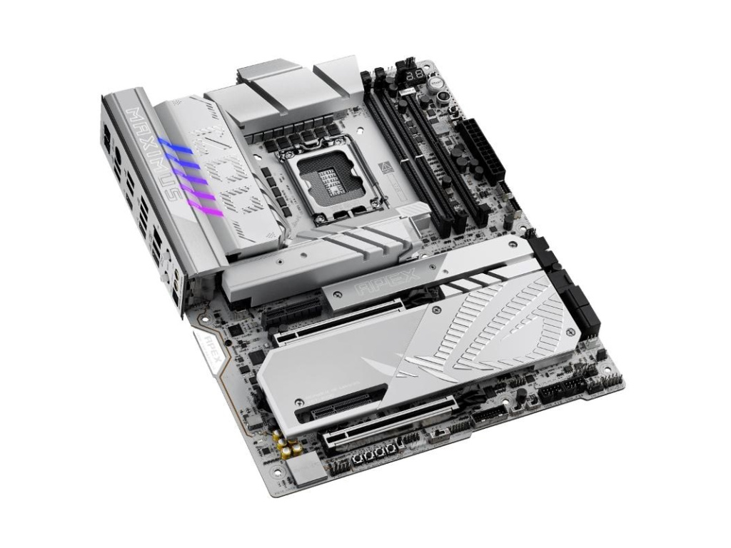 The ROG Maximus Z890 Apex fully supports Intel Core™ Ultra processors (Series 2). Precision-engineered for supreme overclocking, it carries the legacy of the series forward into a new generation. With exceptional power delivery and a two-slot DDR5 memory layout, overclockers can meet and exceed their ambitions for record-breaking CPU and memory performance. For those who favor lighter colors for the aesthetics of their build, the ROG Maximus Z890 Apex features a cobble-gray surface, polished metallic accents, sleek contours and a predominantly silver palette.